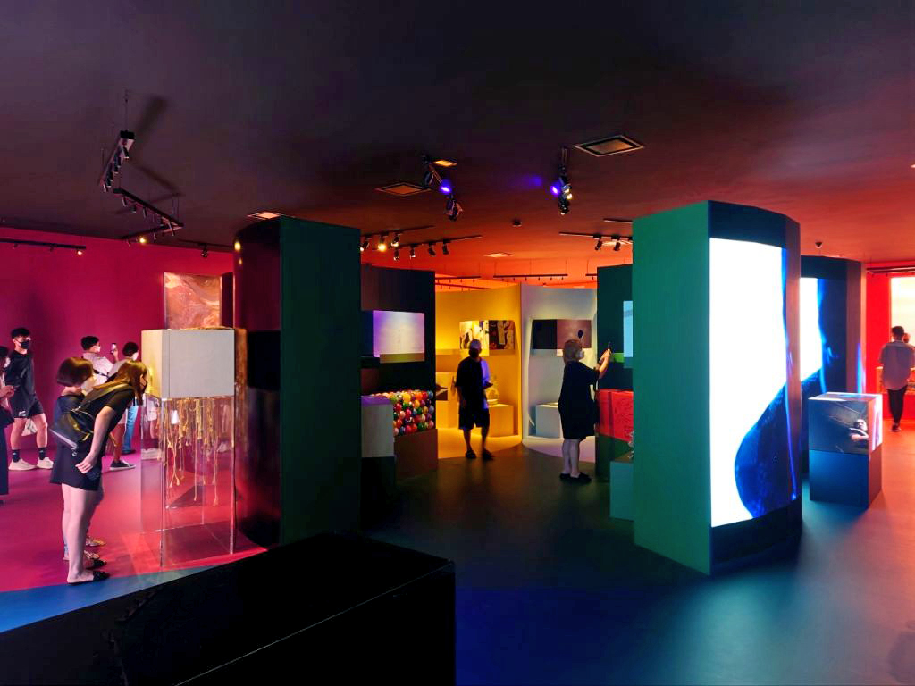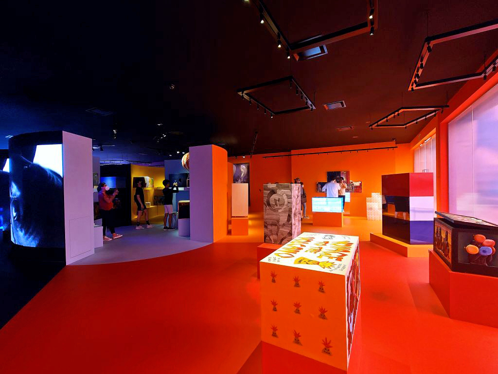 The waiting was surprisingly quite short. We asked one of the staffers how long we would need to finish the exhibition, and she told us that it would not take longer than 30 minutes. When we got in, we were told that we had to be “briefed”. Standing in front of two trunks—one like a dismantled coffin (by Italian architect Gsetano Pesce), the other opened to reveal a pop-out bricked birthday cake by Lego—and the adolescent chap conducting the briefing, we were reminded “not to mask off” and “not to touch the exhibits”. And then we were shown a door to his left, held ajar by another young fellow. Inside, the first room, it was dark, with a lightbox of a trunk sitting in the middle. The roughly ten people in here were all scrambling to take selfies, even when the lights were low. On all four walls, multiple texts were projected on them, among the words, three appearing together were extremely familiar: “past, present, future”.