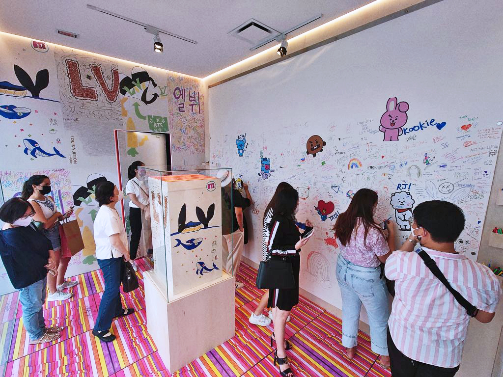 But the most popular—and the brightest—room has to be the one singular space dedicated to the biggest boy band of today: Bangtan Sonyeondan, better known as BTS, whose members often wear LV, such as at the recent Grammys. As we approached that room, we saw visitors waiting outside and wondered why. It soon became clear: It was packed. Within the space, much smaller than Jamie Chua’s walk-in wardrobe, excited female fans were scribbling on the window-facing white wall, decorated with the cartoon avatars of the band members, flanked by two with facsimiles of the drawings and scribbles that appear on their trunk, which is placed in a portrait orientation, like a headstone.