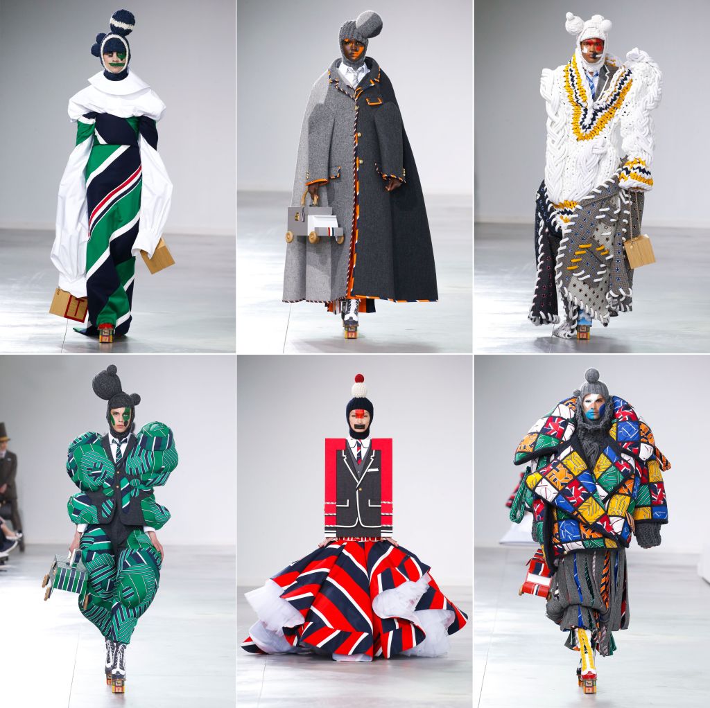 The show could be considered a two-parter: the first, what would be ‘standard’ (not disparagingly) Thom Browne. The regatta blazer with a particularly constricted tailoring that is very much a part of the brand’s recognisability plays its versatile role. The pieces are designed to be gender-neutral—teamed with skirts, no-issue staples among the guys. Most are pleated, with inserts that could be club ties. Or, paneled with what could be fancy washing machine outlet hoses, in clashing fabrics. Some of the skirts are above the knee and worn over demure wide-cuffed culottes. On the whole, the outfits are enchanting, with a digestible schoolhouse prim that is possibly even more appealing, perhaps, in the US, where the wearing of school uniforms is not adopted.