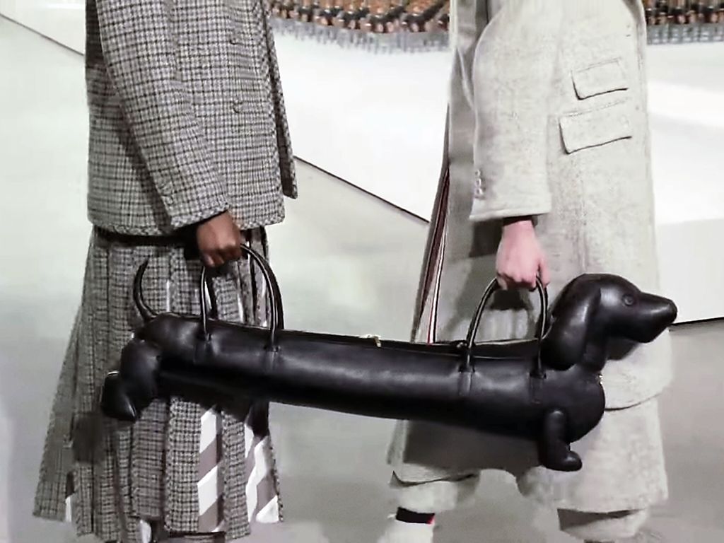 The autumn/winter 2022 show is for both people and bears—teddy bears. In the middle of the show venue, Thom Browne sat a classroom (or conference?) of hundreds of teddy bears, all togged in Thom Browne, naturally. Mr Browne has, of course, a thing for toy animals, and they are there, such as the dog-bag Hector—only this time, it comes with two handles meant for a pair! Toy, as metaphor, extended to his beloved New York, to which the show is also homage to, as well as its inhabitants. It isn’t a surprising expression of pride. Mr Browne has always found kinship through his work with those whose outward appearance we might call gila. He calls his home “an island of misfit toys”. And those outsider-oddballs are dressed accordingly, totting bags that are the plush-toy embodiments of pets, as well as those that are more vehicular. Quite a sidewalk of curiosities.