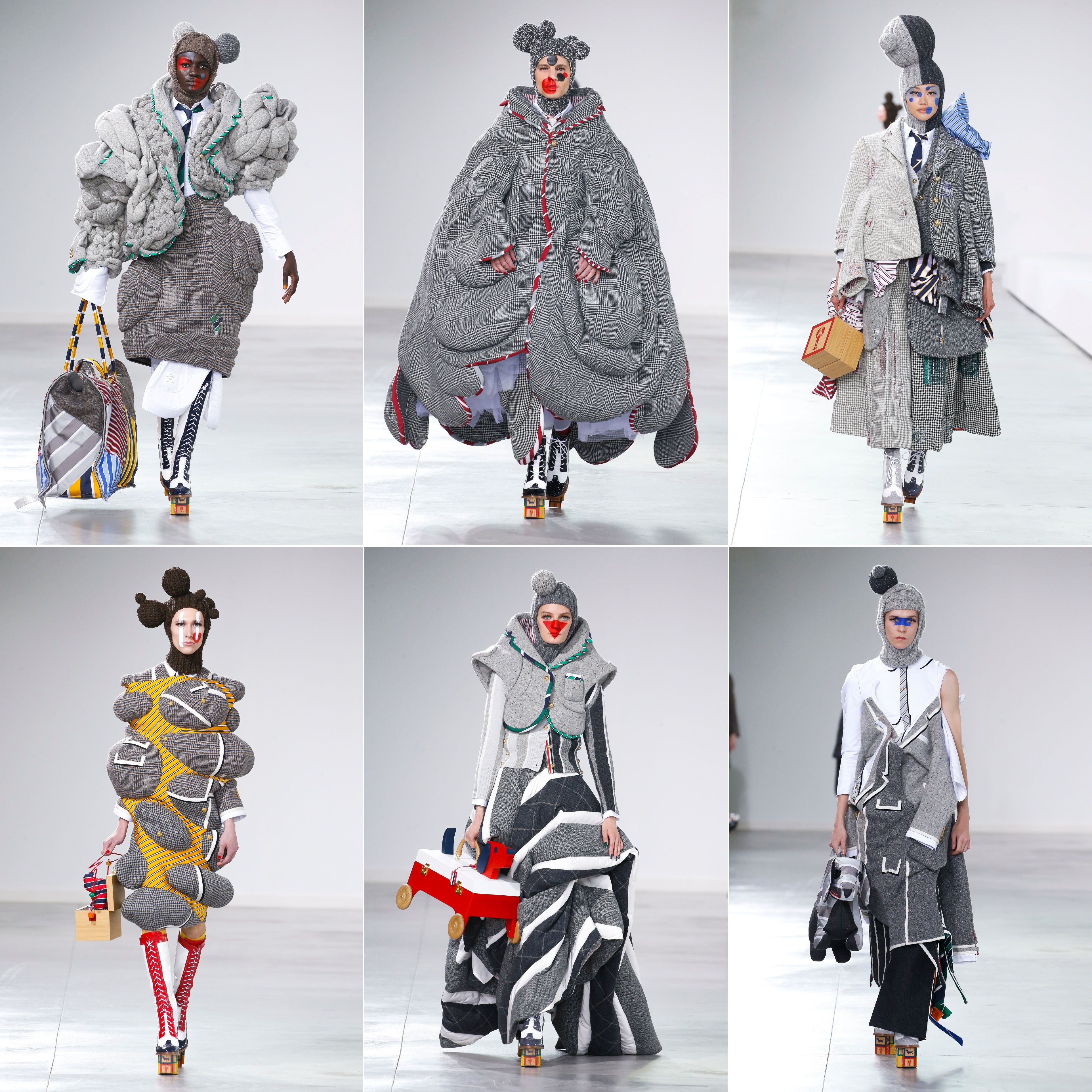 The show could be considered a two-parter: the first, what would be ‘standard’ (not disparagingly) Thom Browne. The regatta blazer with a particularly constricted tailoring that is very much a part of the brand’s recognisability plays its versatile role. The pieces are designed to be gender-neutral—teamed with skirts, no-issue staples among the guys. Most are pleated, with inserts that could be club ties. Or, paneled with what could be fancy washing machine outlet hoses, in clashing fabrics. Some of the skirts are above the knee and worn over demure wide-cuffed culottes. On the whole, the outfits are enchanting, with a digestible schoolhouse prim that is possibly even more appealing, perhaps, in the US, where the wearing of school uniforms is not adopted.