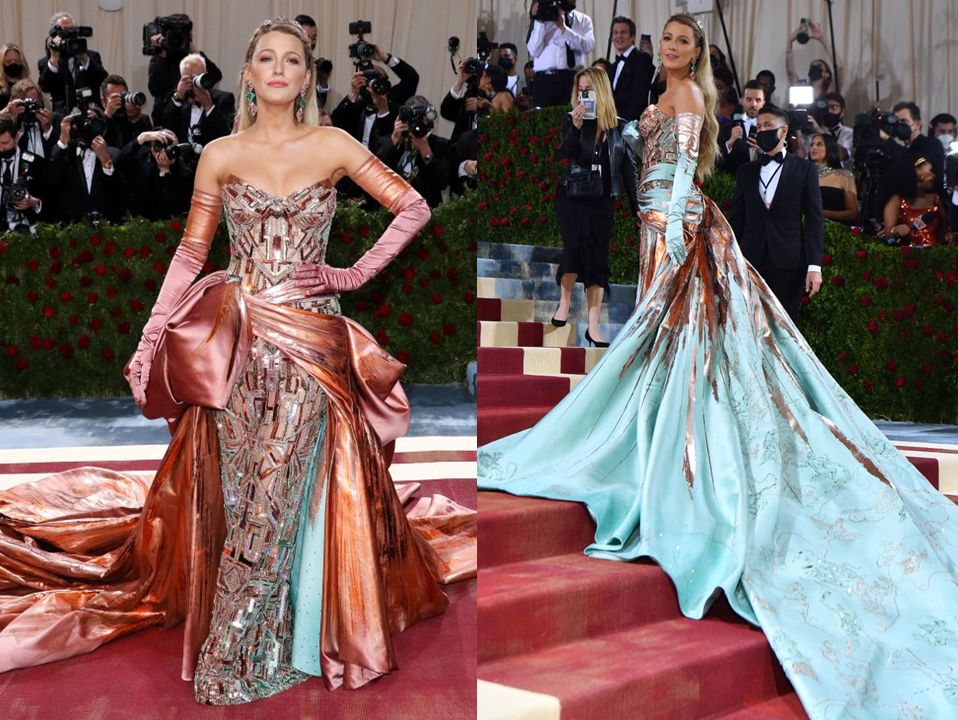 Vogue says, “There’s a reason why Blake Lively is one of the Met Gala’s co-hosts this year. She never fails to wow on the red carpet.” And also why she keeps getting asked to come back. Ms Lively is no Tilda Swinton, and her “wow” attracts less fashion folks than those shopping for a prom dress. Yet, she has been the embodiment of the dressed-up Met turn-out. This year, she bettered herself with a change of look that simply involved the (assisted) releasing of a massive bow affixed to her hip. The Versace Atelier dress, inspired by the architecture of New York and engineering feat, the Statue of Liberty, as Ms Lively said, went from mostly copper bling to the bluish-green that the metal becomes when oxidation strikes, at a mere unfurling of that bow. Despite the quick-change finesse, modernity, as usual, escaped her.