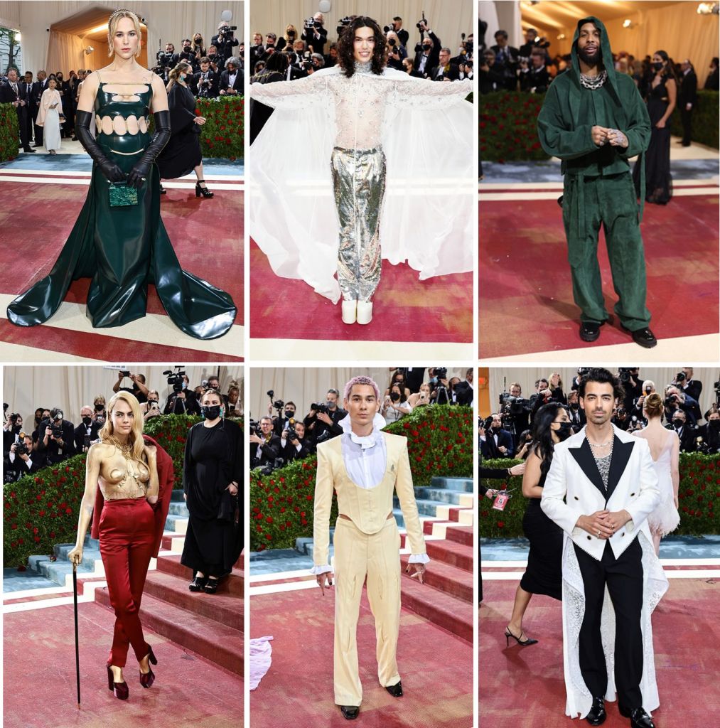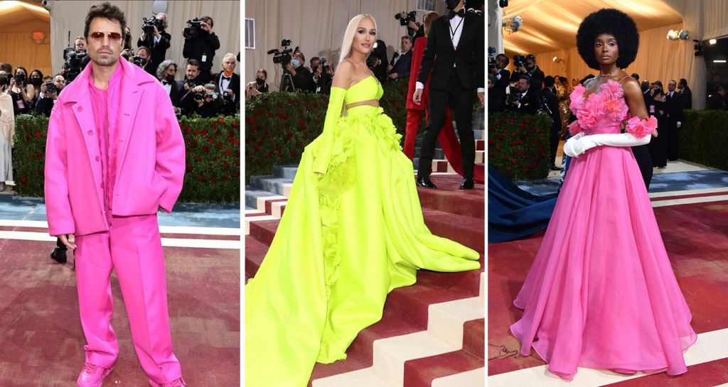 It is hard to link neon with the gilded, but there it was—a blindingly bright green. It is not, however, J Balvin’s hair we are referring to, but the two-piece gown Gwen Stefani chose. A Vera Wang creation, it came with a cautiously shaped bra-top, as if to prevent the insecurity that afflicted Nicki Minaj. If there was one colour that kept popping up through the night, it was hot pink: SZA in Vivienne Westwood, actresses Kiki Layne and Ashley Park in Prabal Gurung, model Anok Yai in Michael Kors, and the many more Anna Wintour would no doubt know. But it was the Valentino pink of the brand’s recent season that appeared repetitive: Sebastian Stan (white tie, really?), Jenna Ortega (with leggings!), Glenn Close (escorted by Pierpaolo Piccioli), and Nicola Peltz (escorted by her husband Brooklyn Beckham). Fortunately, the Met decorators did not go with a fuchsia carpet this year.