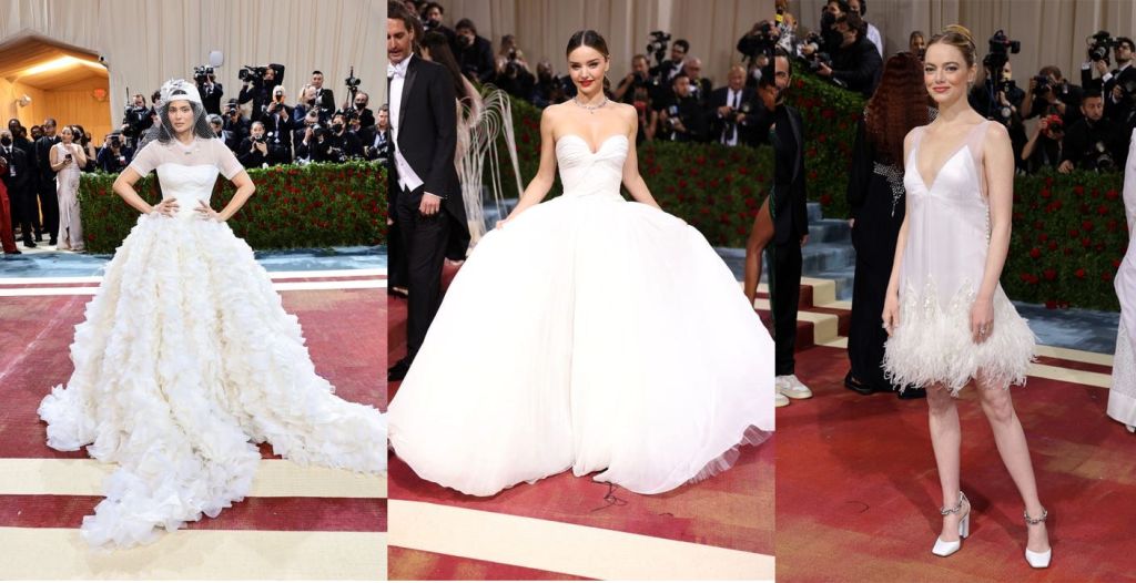 It’s always baffling when women appearing on a red carpet would want to look like a bride. Or, in the case of Emma Stone, a bridesmaid or flower girl. Ms Stone is often quite a red carpet eye candy, even if she is not usually a standout. But this time, afraid of outshining the brides (how did she know there would be at least one?), she chose a bland Louis Vuitton slip. Because conspicuous had to be Kylie Jenner? The cosmetic mogul wore her friend, the late Virgil Abloh’s work for Off-White: a bridal number with a bustier-dress over a sheer T-shirt. Really. Perhaps this was a bride off to a Calabasas wedding? And what about Miranda Kerr? Her Oscar de la Renta princess-bride dress was all audition-ready for the next Disney movie.