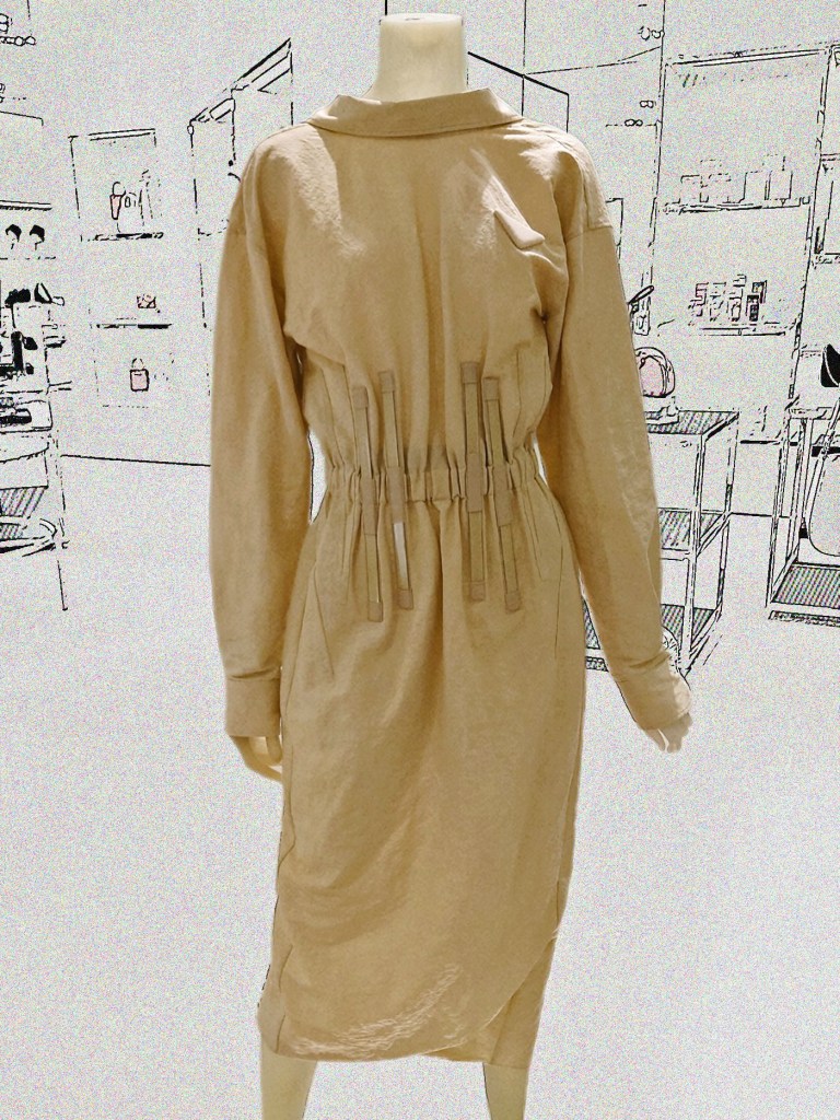 But more compelling is our favourite dress from the house this season: First seen on the runway (and the sales person was quick to inform us), this one-piece is, at it most elemental, a shirt-dress worn back to front. But, as we’ve noted, few item of Prada’s RTW are as simple as they first appear. The dress is of a conventional enough silhouette (to us, a whiff of the Forties), even with the considerably dropped shoulders. The focal point in the front is the waist, positioned not too high up. It is gathered by means of boning, inspired, presumably, by the corset. But unlike the close-fitting undergarment of the past, this boned treatment is not worn to constrict the torso. Nope, nothing as Victorian as that.