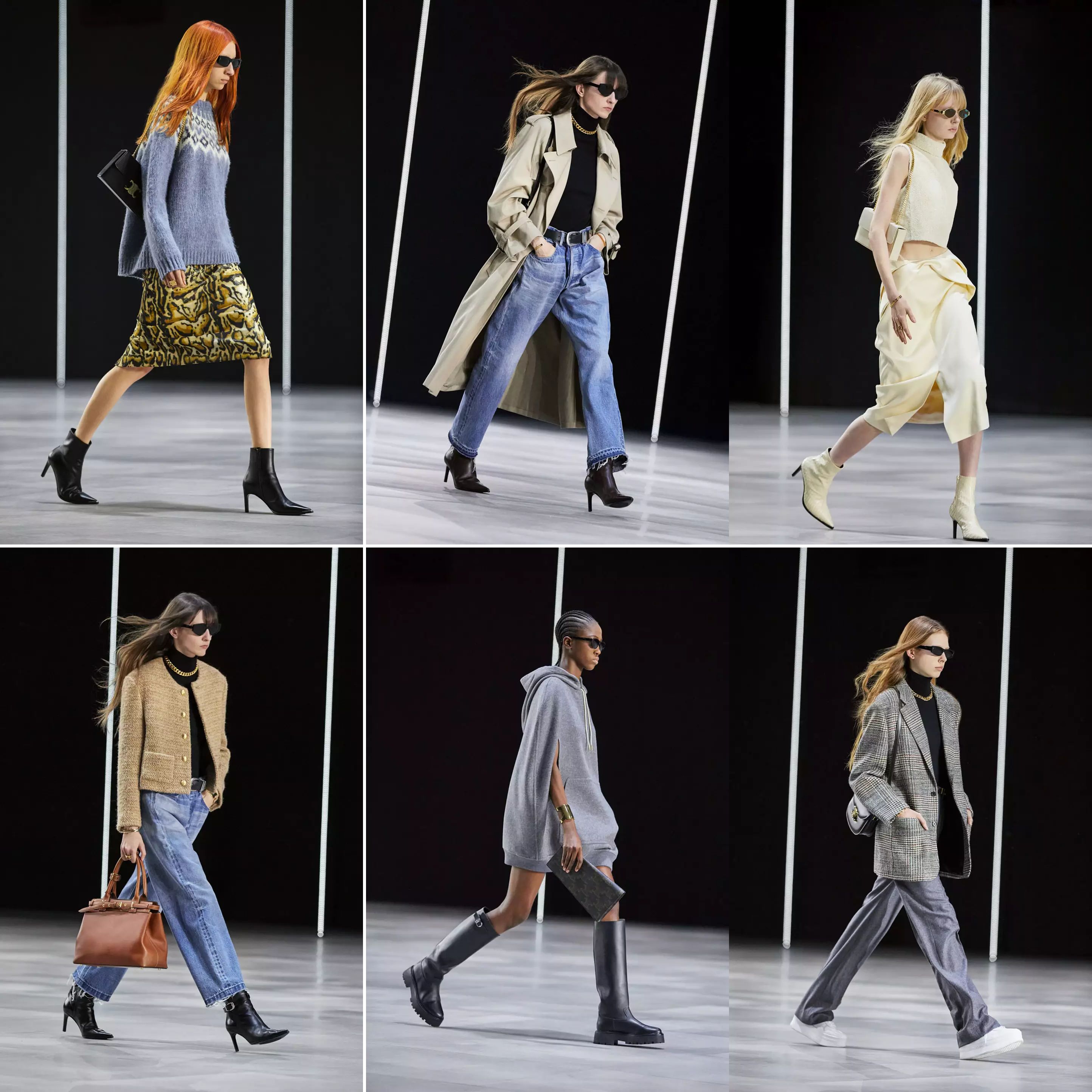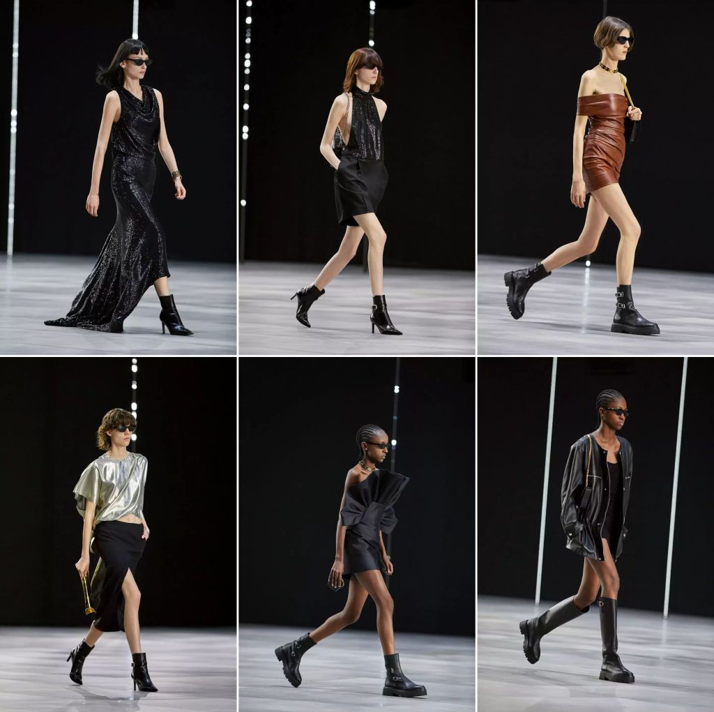 Called Dans Paris (in Paris), the collection purportedly harks back to Celine’s roots. But it has less to do with the decade of its founding (in the ’40s) than the years of its heydays (in the ’60s and ’70s). Turtlenecks are the base for many of the ensembles, worn with thick chain-link necklace, under tops/outers that would be familiar among work-wear aficionados. Jackets are either oversized and slouchy, or boxy and cropped. Denim jeans of a lighter wash are prominent, with their stitched/laundered/unstitched hem. So too are slim-fitting skirts of varying lengths that suggest either secretarial sleek or party-girl scantiness. Leather this or that are aplenty too. Hedi Slimane’s Celine is the go-to label when women need something considered “dressed up” and the compulsory cool, whether a night with the BFFs or impressions-are-important dates. The dress with a ruffled top, the side-boob-revealing halterneck blouse, the long sheath with cutouts at the waist and the slit in the middle—and others—attest the truth of that observation. These are feel-good clothes for a good-time out. And the times are back.