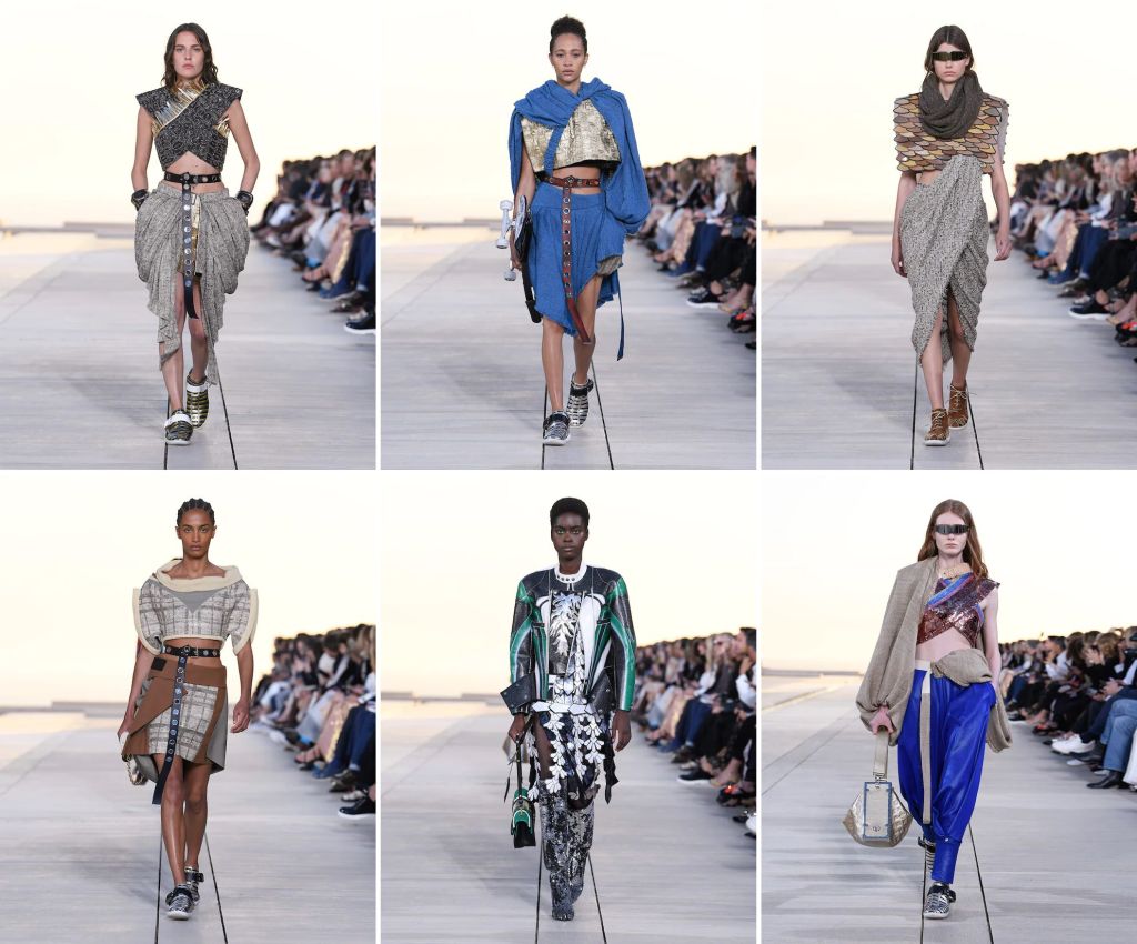 Discounting those, the collection has a discernible wearability about them, but probably just so. The above-mentioned shell tops, cropped (to better fit the squares of the Instagram grit, assuming you still crop your photos to that shape?) and looking anything but sexy. A few are composed of ‘scales’, (some matte, some irridescent. The idea appear as trims too), and are draped with scarves or throw-ons (some with one sleeve, worn), all a tad ancien. The are also the X-shaped tops and those dresses and skirts made of strands of assorted shapes that gives off something gladiatorial. To augment the fierceness of the looks, there is a suggestion of something vaguely dominatrix: The grommeted leather belt worn on the bare skin of exposed stomachs (and the loose end hanging between legs) hint at something that might be construed as S&M. It’s hard to pin the looks or decode them, and therein lies the frustration and the thrill (or, perhaps, just a tingle). We are of two minds about the collection: Not (yet) sure if we like it or do not. The dilemma stems from the unnecessary showiness of the designs (or over-designs?). As one headline went, “Eve Jobs Holds Court in Thong Sandals, Bralette and Skirt at Louis Vuitton’s Cruise 2023 Fashion Show”. These days, you don’t hit the scene, you make it. That is annoying.