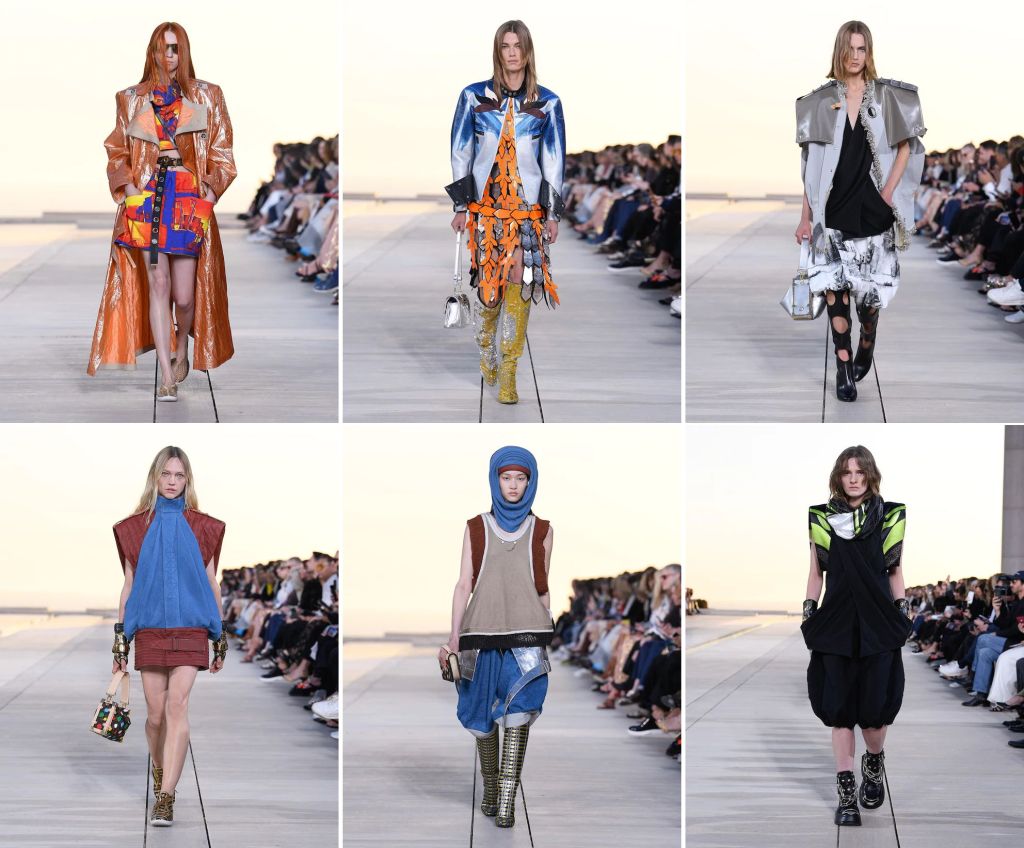 The clothes are not hostile-seeming in a way military fatigues (or the mish-mash of them worn on the Mad Max movies) could be. The show opened and closed with three silhouette-curious looks that seem to serve as eye-opening parentheses, within which the more accessible but no less convention-defying outfits arouse the imagination. The first three, with their tented shapes and floor length, are no gowns we imagine any film star would wear to a movie premiere or on a red carpet. But they are no doubt gowns, as well as some ceremonial robes of an unknown religious order. Glamour is not the intended effect. The last three have even less spots to be seen in: the considerable tops with what could be some flying saucer landed on the shoulders, under which a possible geomagnetic storm raged, would be for parties where the stranger you dress among strangers, the better.