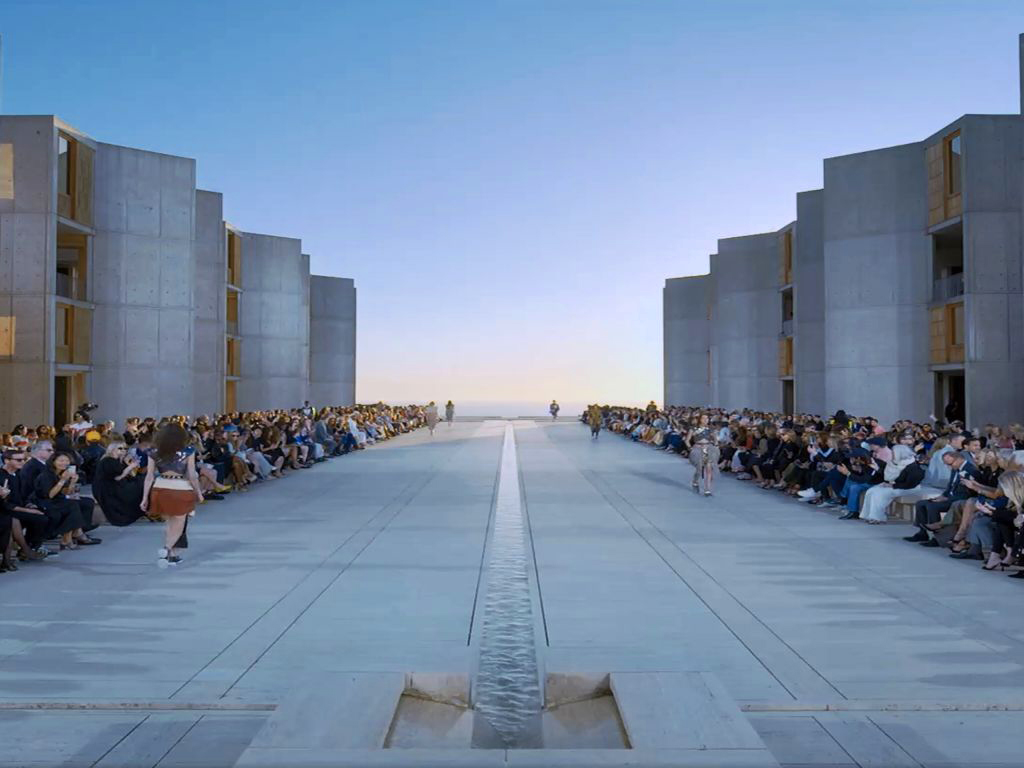 Unfolded between the Brutalist buildings of the Salk Institute, and backgrounded by the setting sun on the horizon of the Pacific Ocean. Other-planetary? The clothes sure are