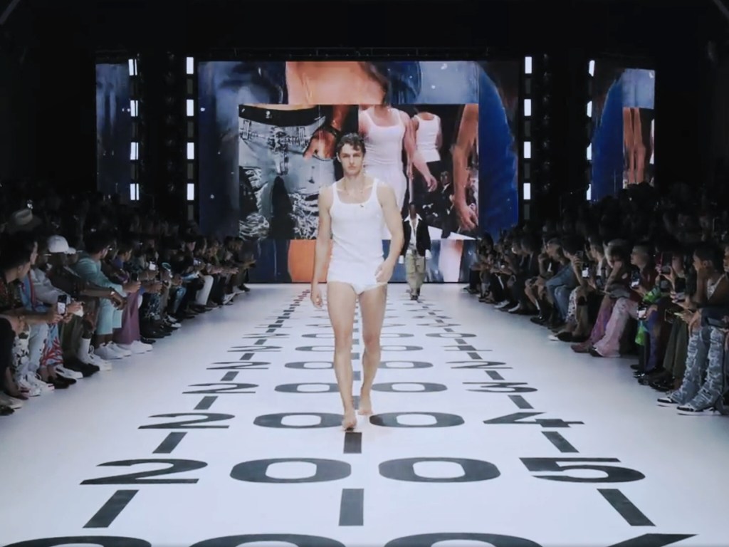 Domenico Dolce and Stefano Gabbana open their spring/summer 2023 show with a model in underwear—white singlet and white Y-front briefs. This is possibly a new progressive; it is clearly not a new normal. Dolce & Gabbana could be refocusing their underwear business, or they could be encouraging men to go the Julia Fox way. Do not bother with inner or outer: if you like, just wear. Why be concerned with drawing lines and making distinctions? If women should not be ashamed of their bodies, regardless of what shape they’re in, or whether they are pregnant or not, men should not be too, since they have, presumably, less encumbrances to deal with. This is, of course, not the first time D&G has made singlets and briefs part of their presentation. But this is not an undergarment show. What were the opening two-piece other than lame—even futile— titillation?