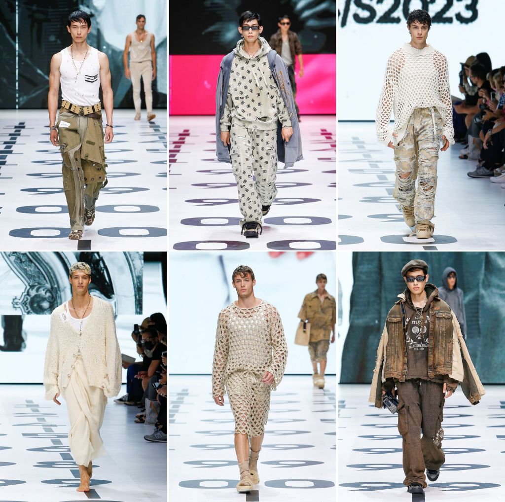 Baring skin is happening so often on the runway (and off) these days that there is hardly anything fresh about the act. Even TikTok is peopled with those fellows willing to go topless, not just in their skivvies. What D&G could be prefacing with the first look is that there is more to the skin show to follow. And there is different-hued flesh peeking from tops that are holed, as if cloth moths had an overnight buffet. They are meticulously tatty so that the wearer could look insouciantly ragged—poor little rich boy. And in shredded pants, too—if Balenciaga can destroy sneakers, why can’t D&G do the same to their trousers? These are seriously ripped (destroyed might be a better word), as if to test the structural integrity of the fabric. One pair of jeans has at least ten slashes on each side of the front legs. It can’t be easy slipping into the jeans, but that’s not a consideration. Looking like a fashionable destitute takes considerable effort.