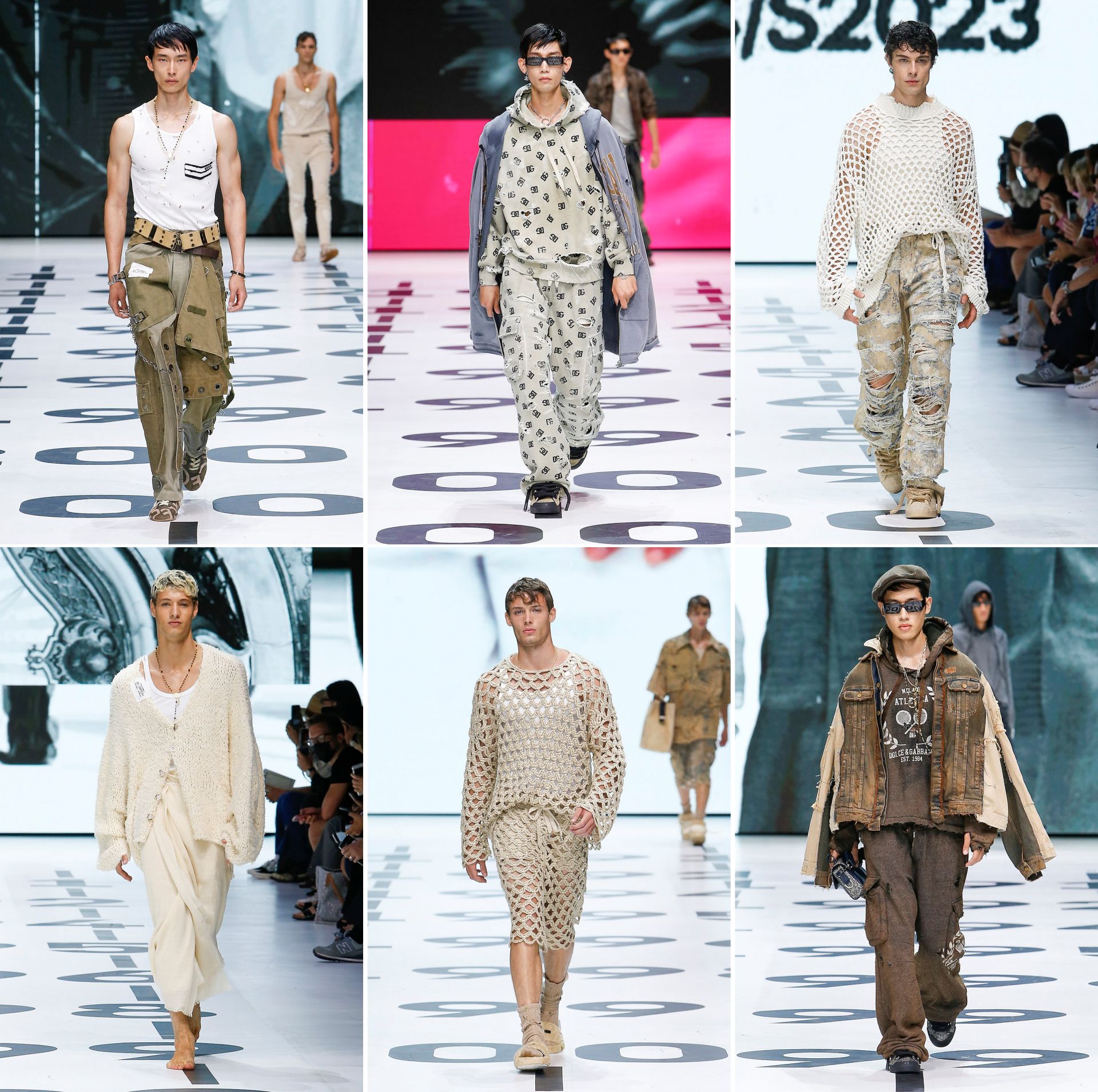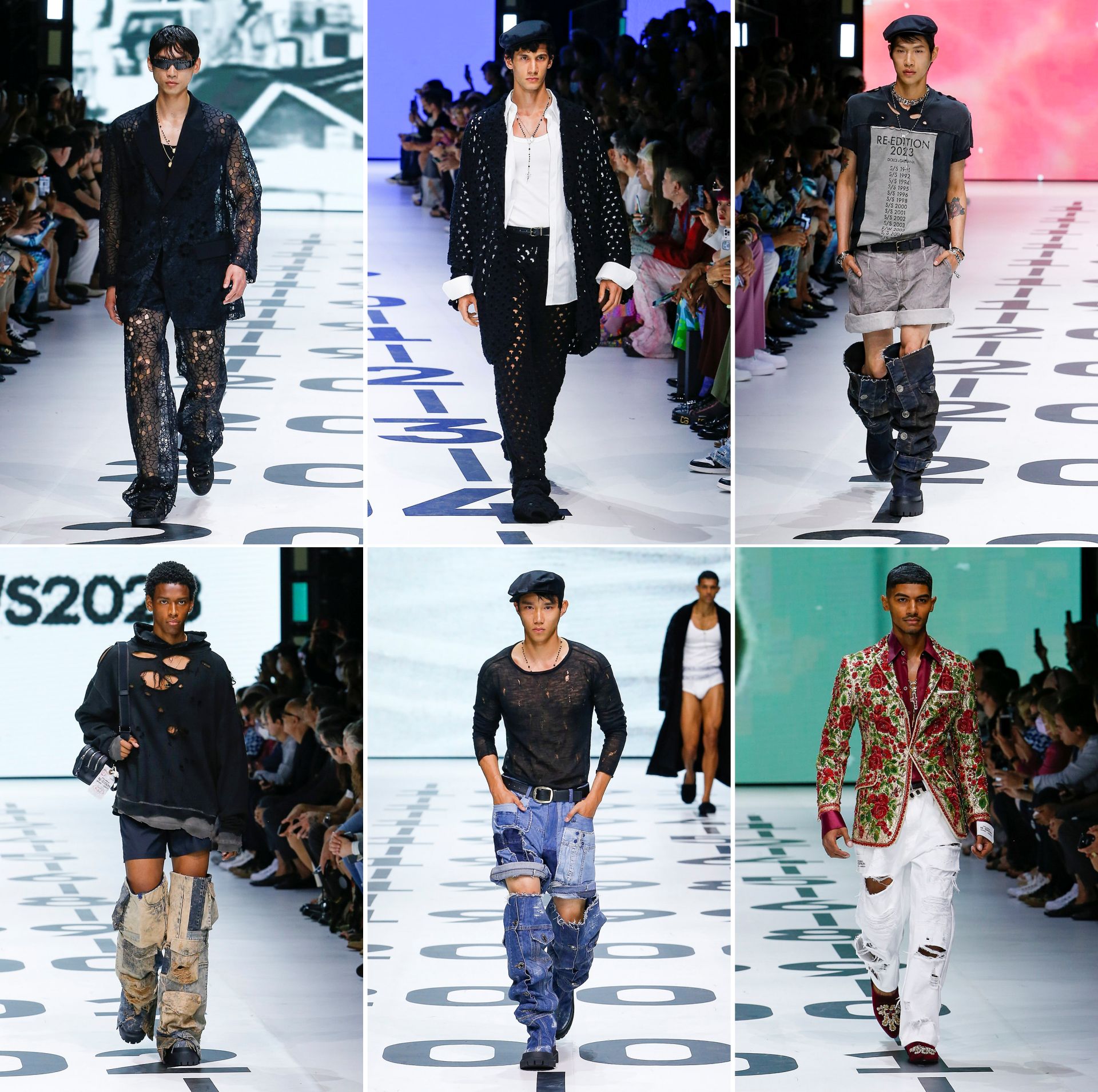 If the clothes seem somewhat rehashed (more lace shirts or religious icons?), that is because they are. The collection is titled Re-Edition, a look back at the brand’s output from 1991 to 2023 that has been prolific of the D&G hallmarks of tawdry—so desirable that there are those who had reportedly ask for them, many a time. It is doubtful that the tailoring, which, to be fair, they do well, is in such I-want-more demand. But a suit, for example, need not be brought back. D&G still offers them. To ‘update’ the selected looks of the past, they puncture the clothes and distress them (one SOTD follower calls the tatters “Sicilian street urchin revival”!) or have more holes by way of unlined openwork fabrics: lace, crochet, and open knits. To avoid the sum effect of looking like they correspond with the clothes of those without any means of subsistence, they pair some of them with proper clothes. The luxurious can go with the miserable.