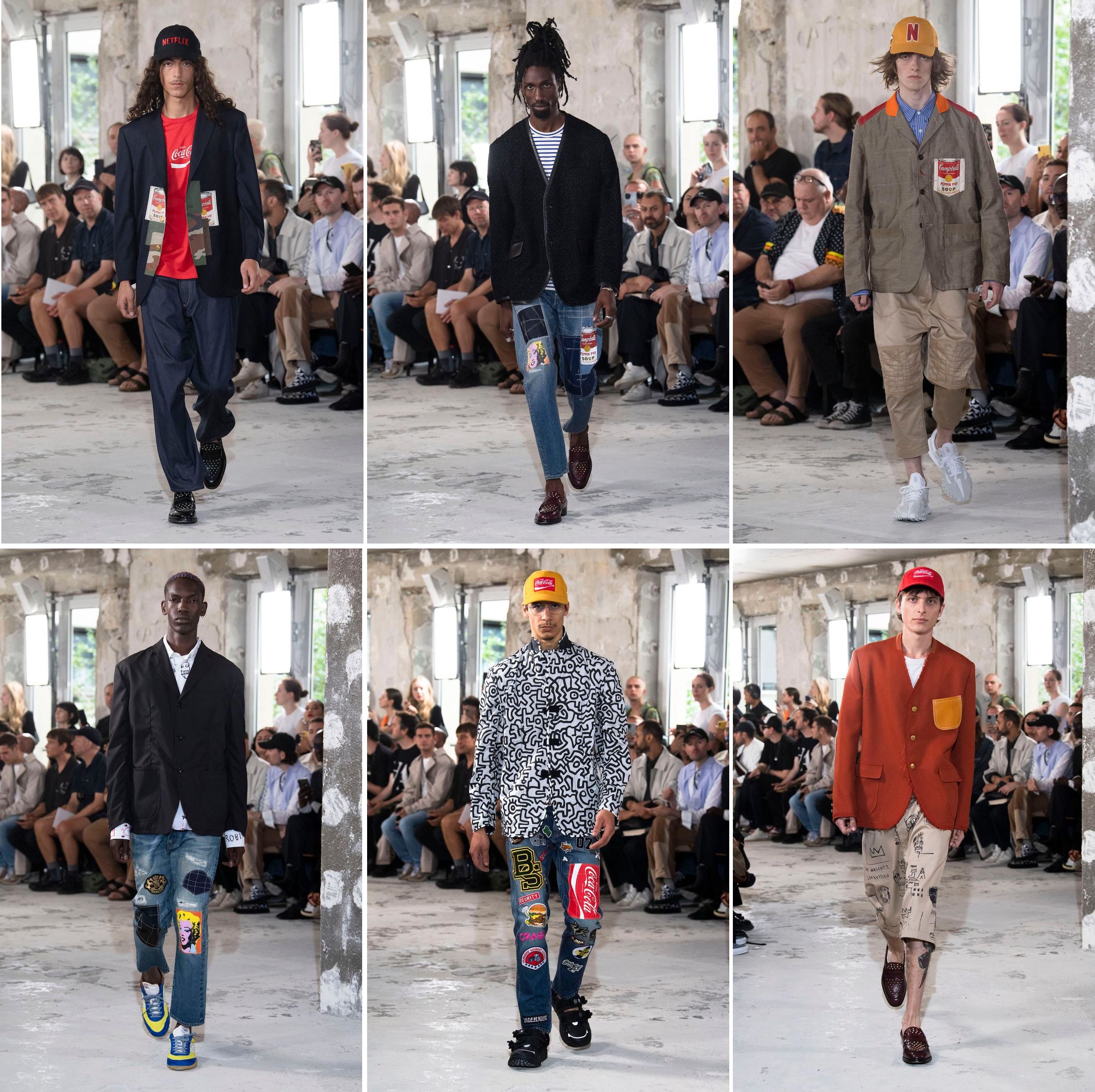 In 1989, Holly Johnson sang in the catchily sarcastic Latinate dance-pop of Americanos (from the Dan Hartman-produced album Blast): “blue jeans and chinos, Coke, Pepsi, and Oreos, movies and heroes, you can be what you wanna be.” In view of the recent overturn of Roe vs Wade, it is irresistible to see Mr Watanabe’s newest menswear as ironic—a poke at the superficiality and materiality of the American dream. Jeans and chinos are, of course, almost de rigueur in his collections, and now Coke (not Pepsi or Oreos) join other brands and names through which America propelled its popular culture, globally: Campbell’s Soups and Marilyn Monroe made vivid by Andy Warhol, Girl with Hair Ribbon painted/dotted by Roy Lichtenstein, as well as the graffiti and scribbles of Keith Haring and Jean Michel Basquiat. It is, interestingly, not “’bout leather, leather everywhere”, as David Bowie sang earlier in 1975’s Young Americans, a song that has been compared to Americanos for its dig at US youth culture.