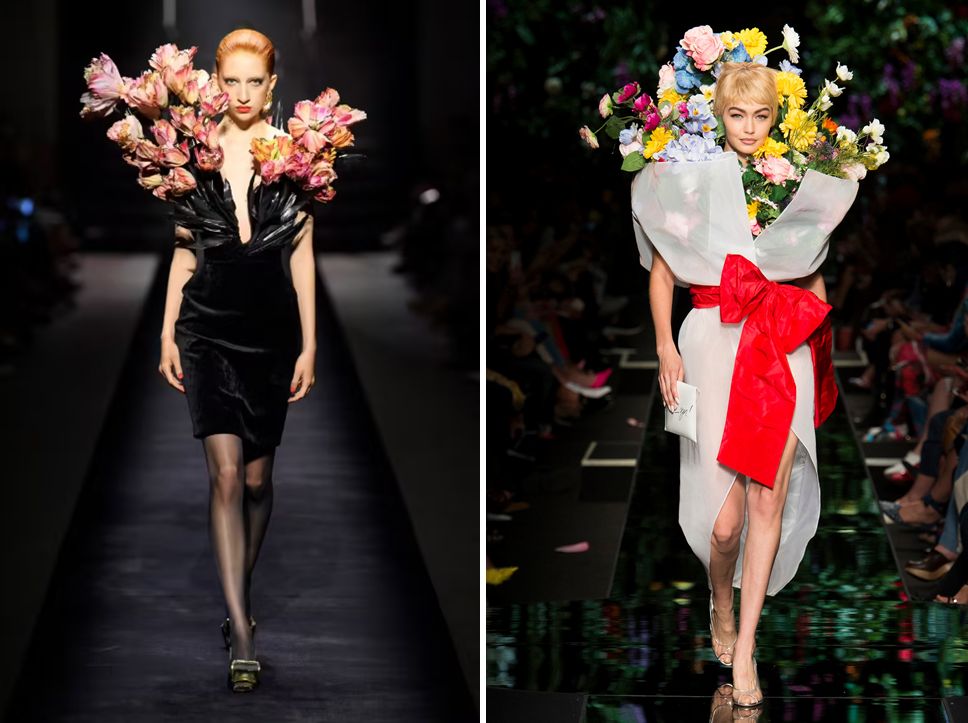 Nosegay or bouquet? (Left) Schiaparelli couture autumn/winter 2022 by Daniel Roseberry. Photo: Schiaparelli. And (right) Moschino prêt-à–porter spring/summer 2018 by Jeremy Scott. Photo: Indigital.tv