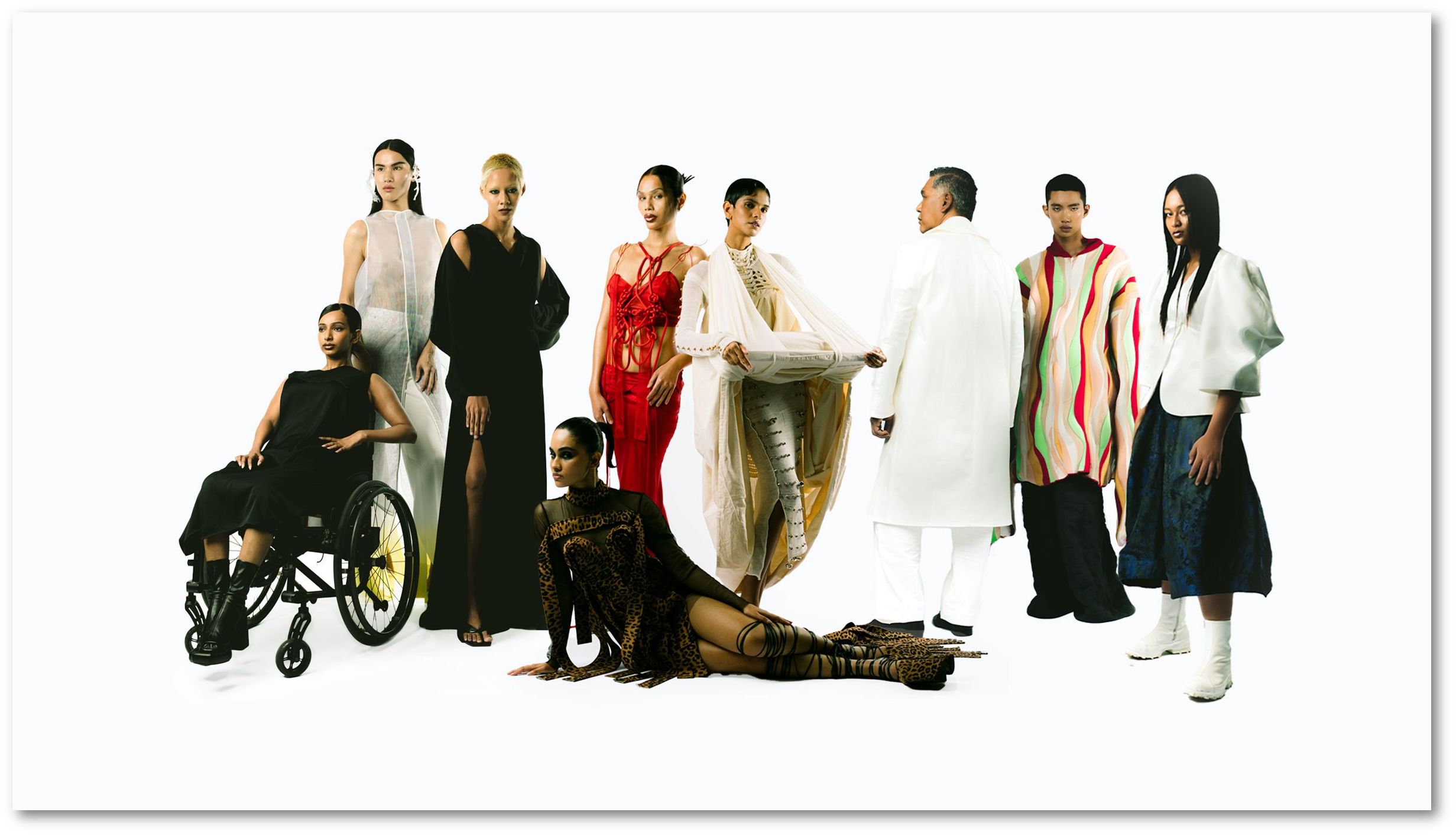 The shoot did not benefit from the minimal or zero styling, although two photographer’s assistants are listed as “stylists”. One magazine and commercial stylist told us that he thought that “there is no styling” since “the hair doesn’t go with the makeup, which doesn’t go with the outfits. What has anything got to do with anything? The models look like they were just plonked there.” As they would be in a TikTok video? What stands out to us is how the clothes could not be seen clearly. For an image that speaks for an exhibition extolling Singaporean designs across generations, the focus, curiously, is not on the clothes. The Biro coat (second from right) was shot to show the bafflingly washed-out back, a rear that has no superlative design to speak of. The Thomas Wee shift (extreme left), with dramatically draped details in the back, was worn by the usually beautiful quadriplegic model Zoe Zora seated, front-facing, on a wheel chair. The campy layered, draped bustier of Harry Halim (front) on a model laid on the floor was completely consumed by some unknown entity intercepting the light. But perhaps, as with most G-Zers, fashion does not matter, the look does.
