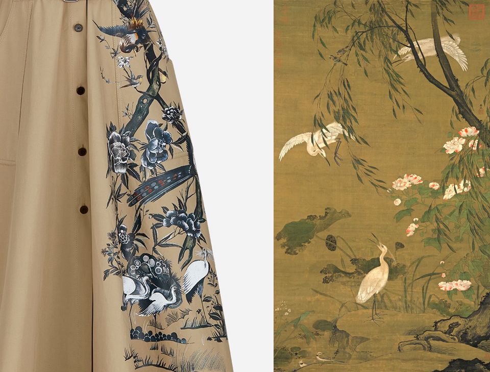 Last week, the first complaint emerged on Weibo, when one Netizen sharing a side-by-side photo of a Dior varsity jacket and a traditional Chinese 花鸟画 (huaniaohua) or flower-and-bird painting, with the garment sporting similar blooms and winged vertebrates, even colours. Others started posting photos of a dress and a trench coat with prints that owe their similarity to Chinese paintings that are evocative of those of 10th century (or later) China. It doesn’t help that the choice of the “beige” fabrics is not dissimilar to (now-aged) Chinese paper or silk on which those paintings were executed.