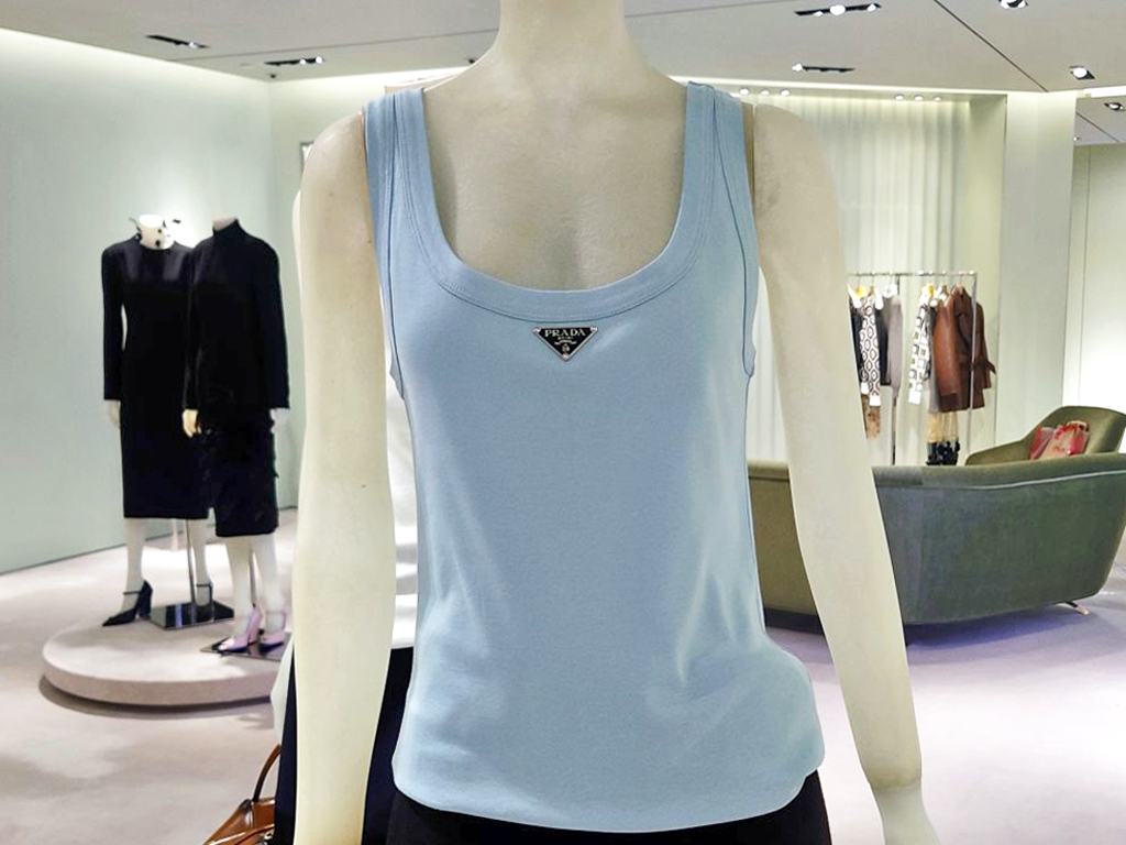 To be sure, the Prada singlet has a nice hand feel. In baby-ribbed, cotton-knit jersey, it is soft and surprisingly rather thick and does not yield easily to enthusiastic stretching, possibly due to the heavier-gauge yarn used in the fabric, and that it is for the fall season. The neckline—described as “scooped” but is rather squarish—and the surprisingly wide armholes are piped (quite widely) in the same fabric as the body. Although of a “fitted silhouette”, as per Prada, the singlet sits rather loosely on an average-sized woman. In the middle, right below the neckline, a recognisable Prada inverted triangle in enamel catches attention, like a third eye—here, seeing from the cleavage. Without this, the singlet, even if it “embodies the luxury of simplicity”, would not have stood out from its less-worthy ilk, such as those by Hanes or the Japanese brand Gunze.