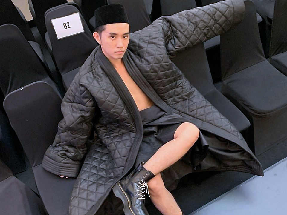 Barely three weeks after the chest-baring controversy at Kedah Fashion Week (KFW)* that led to nation-wide disapproval and apology from the organiser, Malaysia is seeing another contentious fashion choice that riled up the watchful, not-necessarily-fashion-consuming public, this time in the capital. At the closing day of Kuala Lumpur Fashion Week (KLFW) 2022 last Sunday, the city’s “king of viral fashion” Tan Kel Wen (陳楷文) attended the show of his own label Behati at the Pavilion Kuala Lumpur mall in a self-designed, oversized, ankle-length, quilted happi coat (it was 31°C that afternoon in KL) over a pair of folded-down-at-the-waist, knotted-in-front-like-a-sampin shorts. The 26-year-old, who has no qualms in casting himself as a model in his brand’s communication material, was shirtless under the outer, but it was not specifically this show of some skin that irked Malaysian Netizens. It was his choice of headwear: A black songkok—traditional, flat-top (atap leper) headgear worn by Malay males throughout the Malay/Indonesian archipelago, Brunei, and the south of the Philippines and Thailand.