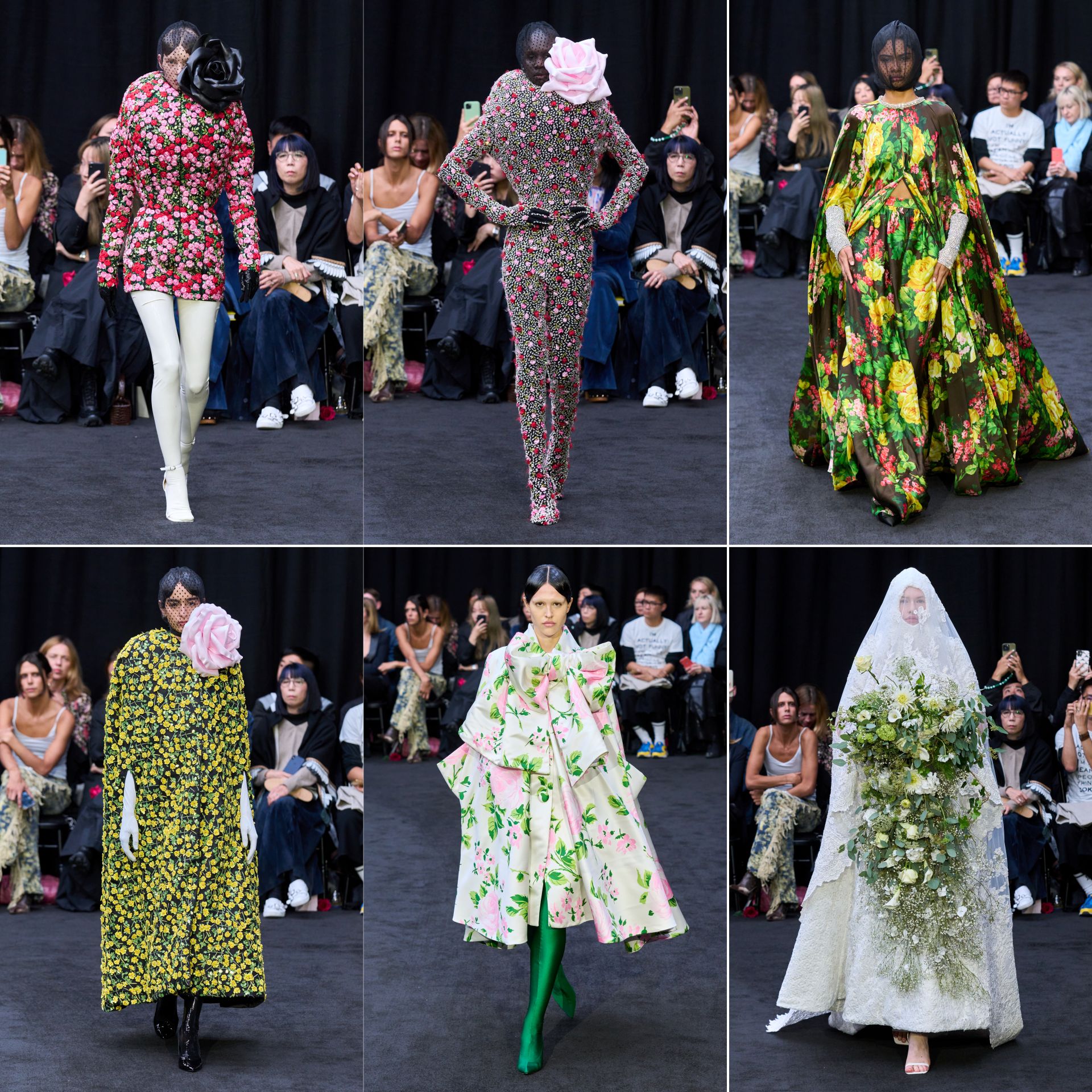 Once the regal beauty ends, we are back to familiar, flower-packed, colour-saturated territory. This is indeed spring. Apart from the recognisable floral swing coats, tented dresses, bell-shaped capes, and oversized bows, there are now strange bodysuits in egg shapes from the waist up, some with the raised bumps reaching the ears—their forms no doubt would have baffled the award-bearing Queen of 2018. Were these Fabergé-eggs-turned-bodices given a floral makeover? Heaving chests in placed of augmented bustiness! These are, naturally, in keeping with Mr Quinn’s predilection for exaggerated shapes, or reimagining the line of the shoulder, as he did last season, confounding viewers with the question: Where does it begin or end? Or, are these for the potential mates of Elihas Starr, Marvel’s villainous Egghead?