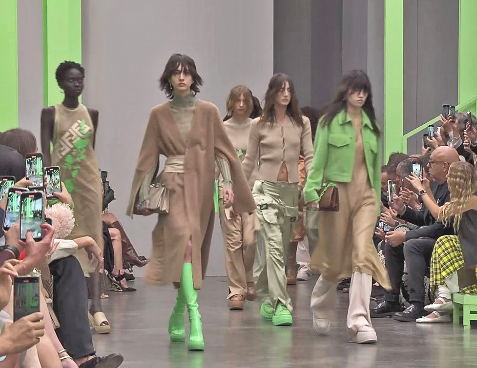 To be sure, there are other colours in Fendi’s spring/summer chromatic proposals, but it is that green that bothers us. Two weeks ago, Kim Jones dabbled with the blue of Tiffany for the resort 2023 collection. They appeared on clothing and accessories. That particular blue is so associated with the brand that it bears the name of the company. And it is so identified with the retailer’s boxes and paper bags that it’s hard to imagine it for boiler suits and, harder, for the Baguettes. Yet, the colour was used sufficiently. And now for the Fendi RTW, there is that what-do-you-call-it green. To be sure, this does not have the same visual impact as Bottega Veneta‘s eponymous green, introduced under former designer Daniel Lee’s tenure, during the spring/summer 2013 show. Still, it perplexes us, especially when a model in a pair of platform slides in that green nearly fell and, out of her own safety, decided to remove them, and hold them in her hand. Are they uncomfortable slides? Are they hard to walk in? Is it the green that should be on kindergarten walls, not clothes or footwear?