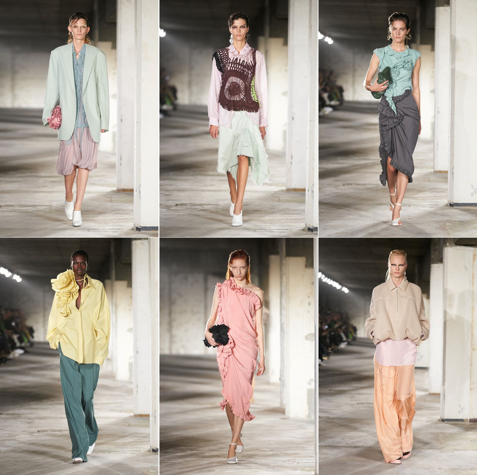 With Dries van Noten, the output is always a sensorial win. With the exception of some jewellery, there is no need for glittery ornamentation to make any of the outfits stand out or speak, even in the eveningwear. One loose-fitting, but still shapely jacket is bunched up in the front and secured by pins. A dramatic black top—worn with shorts!—is an asymmetric heave that looks like a fichu fluffed up. On a skirt, plissé swathes draw together in the front and cascade as an off-centre bustle. Pleated medallions sit atop gathered tiers in free-flow abandon on a top. Elsewhere, ruffles curve around the body and end on the hem, or meander and then become rosettes—and nothing flamenco about them. There are openwork knitwear gilets that could have been handicraft macrame bags repurposed. When it comes to the florals, there are more permutations that what you’d find in nature; the pairings and the layering, crumbly or crushed, sometime recall those from past collections, but no less arresting.