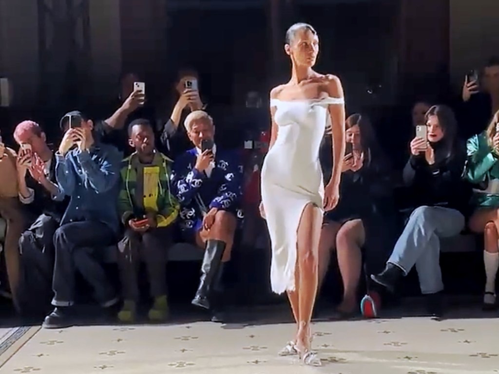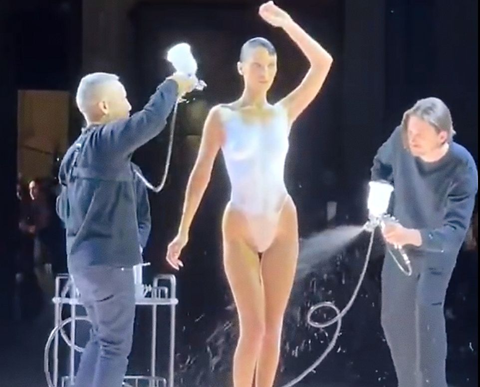 It is for sure a moment for history. The last look of the Coperni show yesterday saw Bella Hadid emerges in nothing but a thonged panty and a pair of heels, her right arm covering her breasts. She steps on to a low platform, and designers Sébastien Meyer and Arnaud Vaillant—hands with equipment very much similar to a spray gun used in spray painting—begin spraying the model. The sprayers dispel a white foamy liquid that quickly cover her body in opaque white (Ms Hadid slowly removes her arms as one breast is covered and then another). Those old enough would remember this as ‘airbrushing’. Very soon a semblance of a garment could be discerned. The body-con (naturally!) dress took about seven minutes to complete or about the time it takes to cook hard-boiled eggs. Talk about fast fashion!