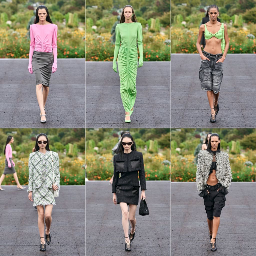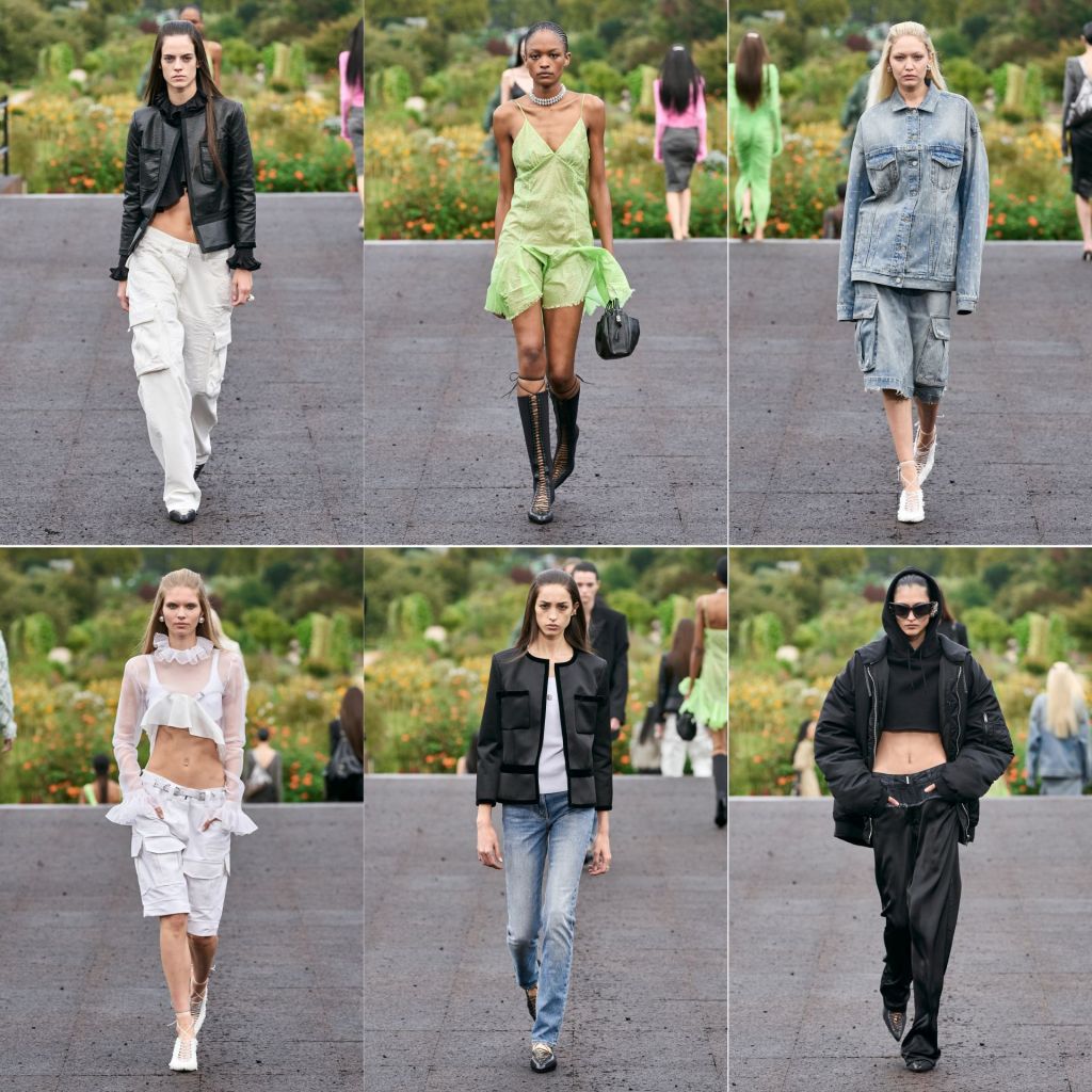 Supposing, as many did, that Givenchy suffered from an identity crisis before, it still appears unresolved. There is a conscious tempering of Mr Williams’s initial streetwear-gone-luxe with sleeker dresses, and Ms Roitfeld’s well-loved slim skirts. But does Mr Williams really need the visual stimulus that Ms Roitfeld presumably could provide? And did Los Angeles native really benefit from it when he seems to be still tied to LA? Some pieces are puzzling and the antithesis of ‘French girl style’, such as the frightening oversized denim trucker and cargo shorts (they are cargo jeans too). Even Bella Hadid can’t save the denim bra-top and the dirty-looking jean-skirt. Some are sad clichés, such as the boucle skirt-suit or jacket with, gasp, bleached denim cargo jeans and the Chanel-esque round-neck jacket and straight-cut jeans. Others are just duds—military-style cropped hoodie and distressed fatigues or the PT singlet and khaki skirt.