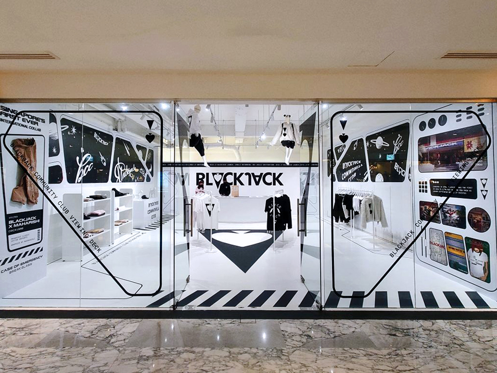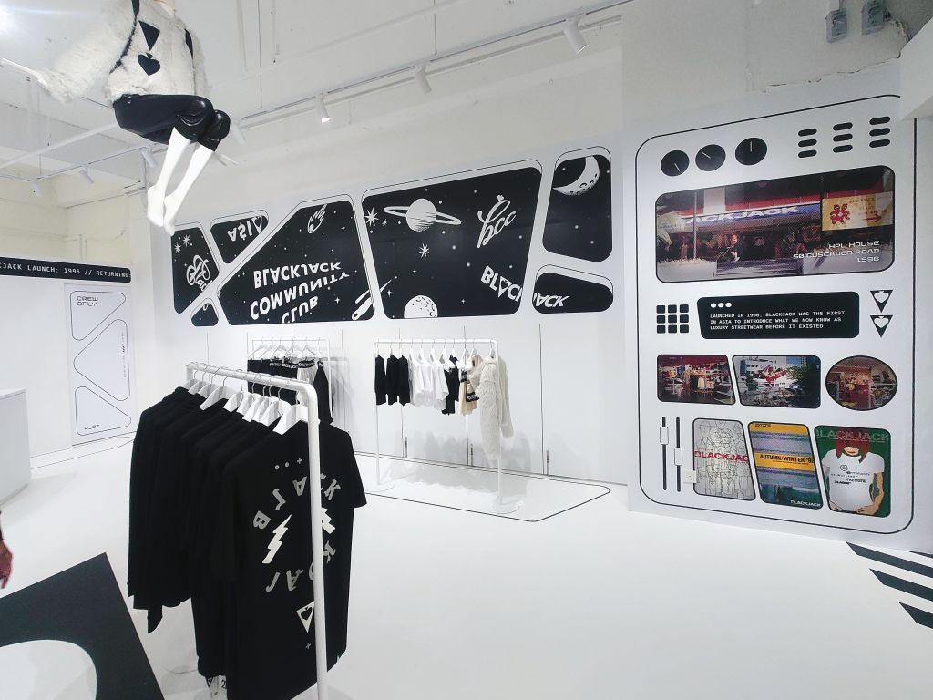 Blackjack is back, as we announced two weeks ago. Once a multi-label store, they are now a single-brand boutique in The Shopping Gallery (voco Orchard) that is conceived to lure the Gen-Z—and younger—customer. That is unmistakable from the minute you come face to face with the all-glass façade of the next-to-the-escalator unit. Unlike the green-top table on which the casino banking game—which lent its name to this fashion label—is played, the interior is essentially in black and white, totally unlike the CC you know in your neighbourhood. It vaguely reminded us of Alexander Wang stores in China (interestingly, the one in The Shopping Gallery, opened in 2012, is now shuttered). And, also Tokyo’s #FFFFFFT and sibling #000T, stores offering white tees and black tees respectively. Blackjack is now a “luxury fashion label”, unabashedly with a street vibe.