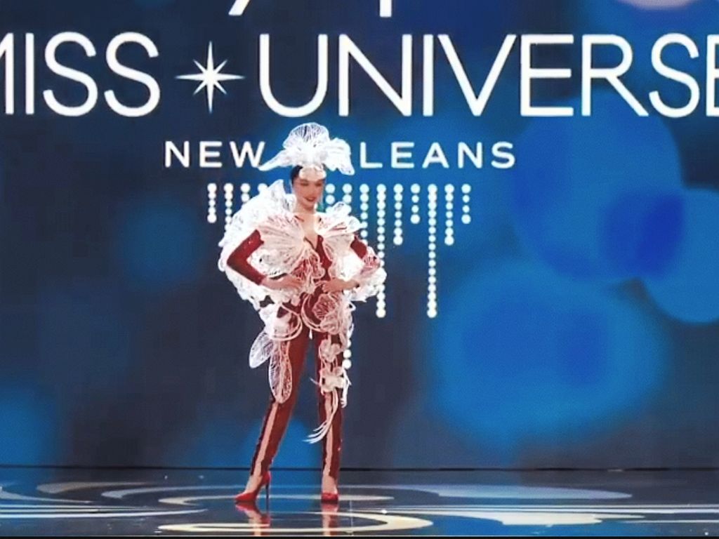 On stage in New Orleans, Miss Universe Singapore in national costume