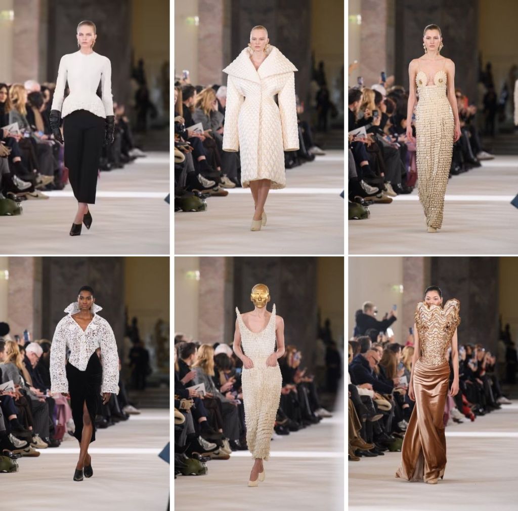 But the business is dependent on those customers who do not come for heads of any kind, worn to complete with the wearer’s very own head. So Mr Roseberry sent out neat, wearable (couture has a different definition for that) outfits that played on proportion and exaggeration, both to varying degrees of success and appeal. That broad shoulders had to be included at a time when they should be retired perhaps suggested his limited repertoire when reimagining the shapes that can be imagined to clothe the body. He seemed to prefer top/front-heavy looks too, sending out a trio of bodices that were rigid and high and sight-of-wearer-obscuring and another other (he preferred ideas to come in threes?) with ridiculous pointed sides that aimed skywards like spires of church towers. And that finale mini-dress and accompanying oversized wrap: in duchess satin and puckered-hem glory. Was it included at the eleventh hour to yield a total of looks in even numbers—32? We wish we would could like the collection more.