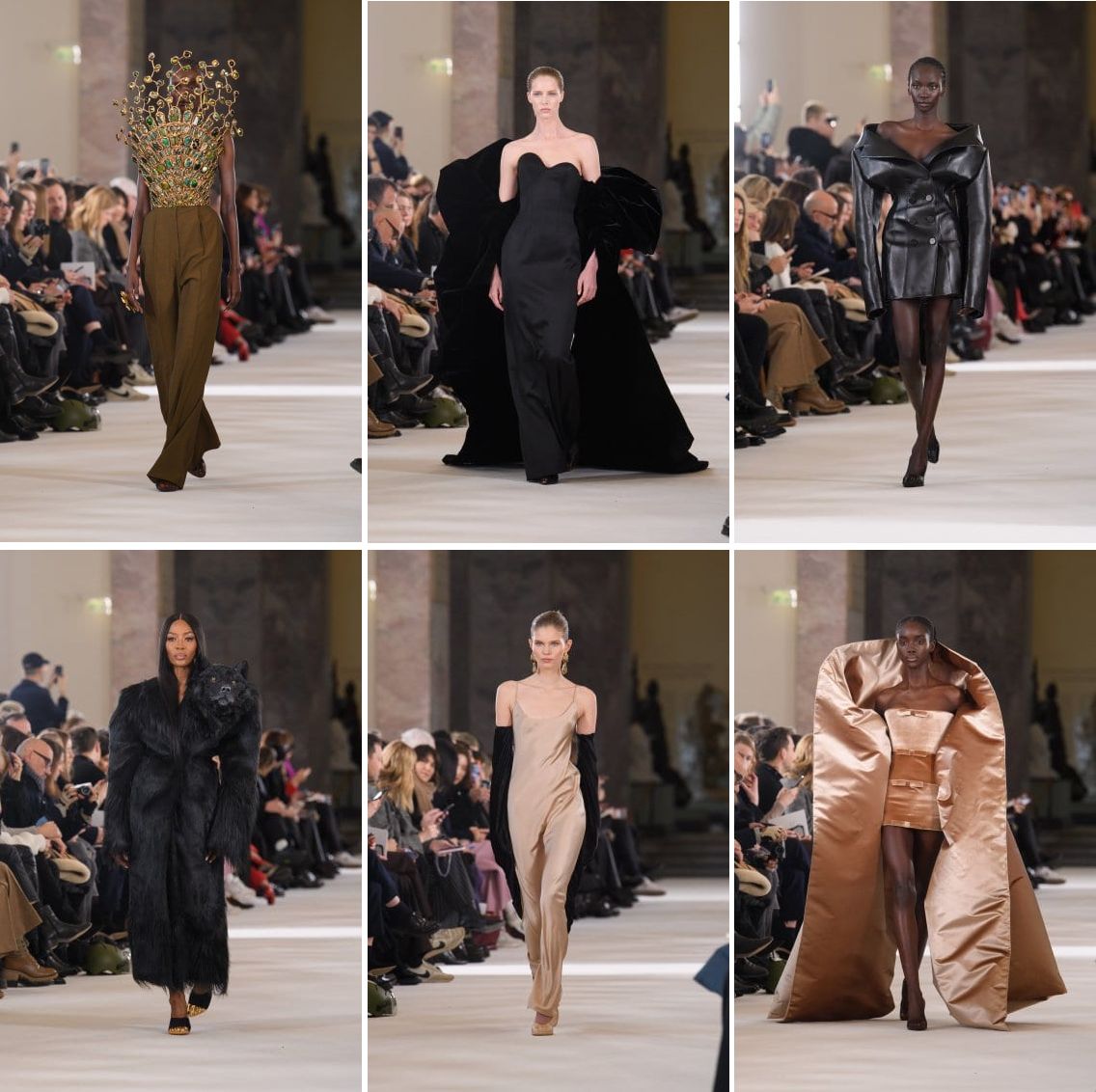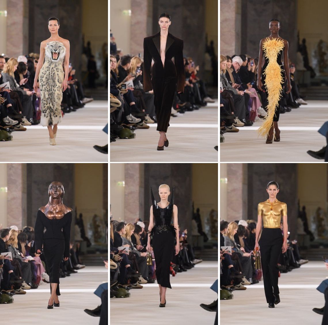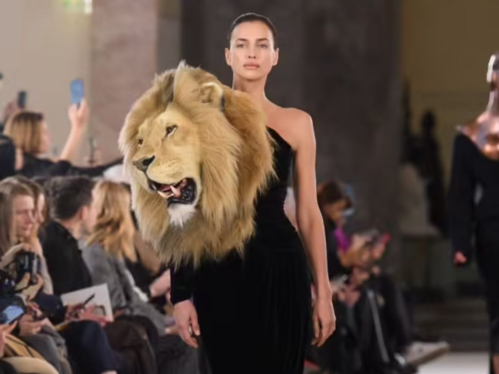 Apart from the majestic panthera leo’s head (on Irina Shayk), there were those of a leopard (on Sharlom Harlow) and a she-wolf (on the she-wolf herself, Naomi Campbell), too. Rather than saying something about the jungle or wildlife or animal welfare, these embroidered bodiless creatures spoke for Dante’s Inferno from the 14th century poem The Divine Comedy. They represented pride, lust, and avarice respectively. The story’s Dante was supposed to avoid these three beasts, according to Virgil, the Roman poet, who appeared before protagonist in the first canto of the poem. Conversely, Schiaparelli’s Daniel Roseberry approached them head-on, showing off the technical ability of the house and their collaborators to create the animals’ heads that were nearly indistinguishable from real-life. We, not Dante, can now come face to face with the animals to see that the “faux” taxidermic output is hand-sculpted from foam and resin, and then embroidered with wool and silk faux fur. In couture, designers would go to all lengths.