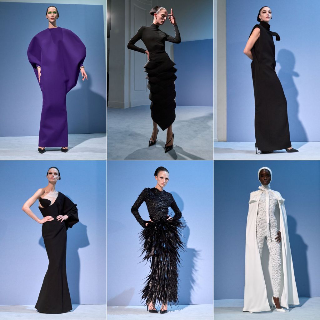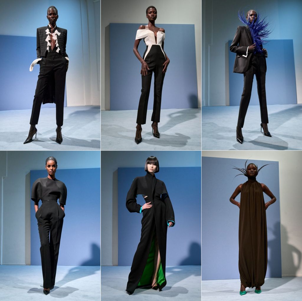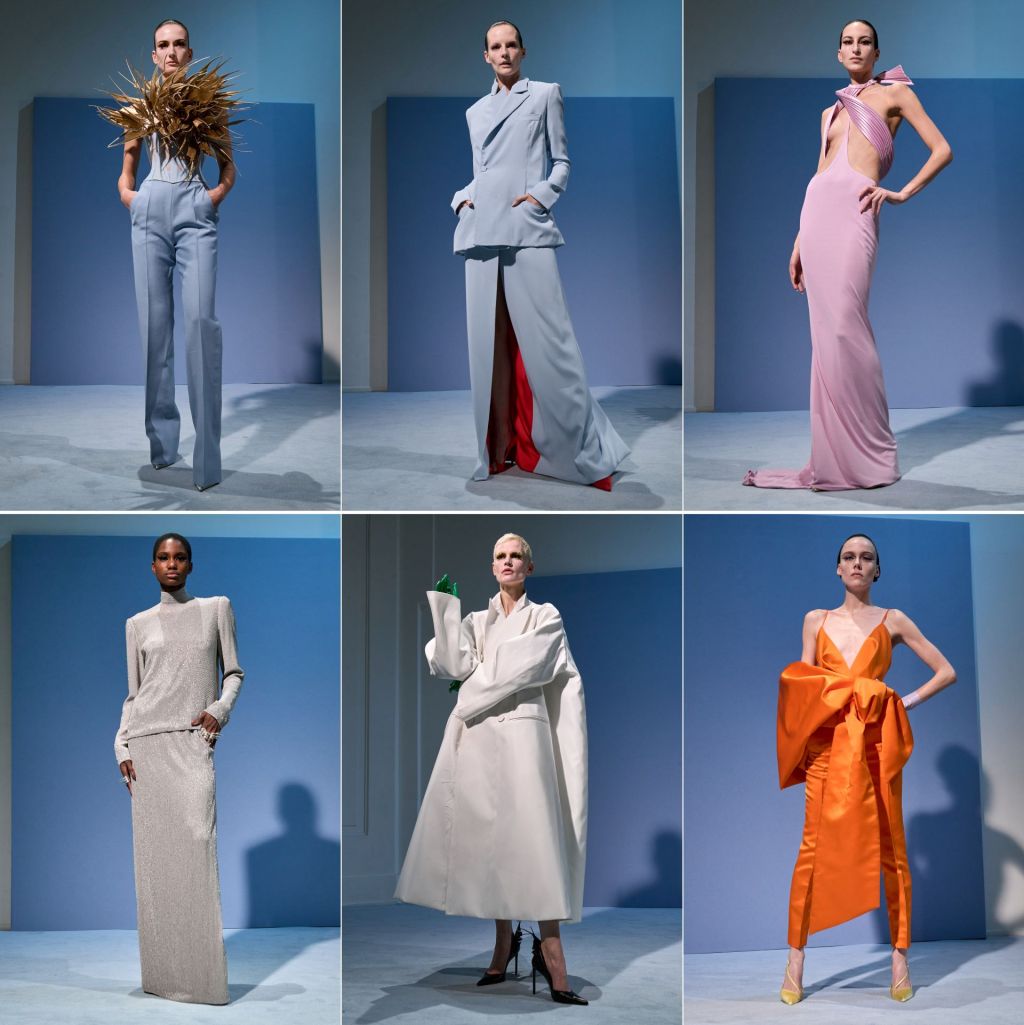 Tailoring has always been the crux of Mr Ackermann’s oeuvre. It was, therefore, unsurprising that it was JPG’s tailoring he wanted to honour. The opening look of a trim redingote with pleated crisscrossed front had a neu-militaire fervour about it, so did the cropped lapel-less piece that followed—a sort of calvary jacket with hand-sewn running stitch in place of braiding and with unfinished oblong tabs along the front vertical hems. Standouts, too, were those looks destined for special occasions. One pink gown had for a bodice a plissé strip that turned and twisted around the torso and neck, another—in royal blue, worn by Raquel Zimmermann—was elliptical at the top and epitome of how couture can astound with shapes. To re-interpret a preponderance of bras-as-outerwear in the JPG body of work, Mr Ackermann had a one-sided version that miraculously emerged from the rear of a bat-winged, one-sleeve gown to cup a right breast, like a hand of a protective lover. The Colombian-born French designer has said, in response to designing for JPG, that, unlike Mr Gaultier, he has no sense of humour. But he did know quirky. Mariacarla Boscono wore a lean, straight-shouldered gown with a deep cut-out in the rear and a high collar with a tailpiece that extended to the left like a ‘wing’ of a zhanjiao futou (展角幞頭 or spread-horn head cover; think: bao zheng [包拯] or Justice Bao), worn by Chinese officials of the Song dynasty. But it was not all this unexpected. The collection would not be lacking if some pieces were omitted, such as the tracksuit-y two-piece or the pantsuit with a hood that was embroidered inside.