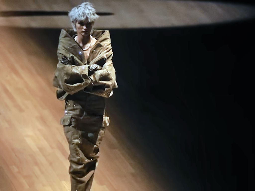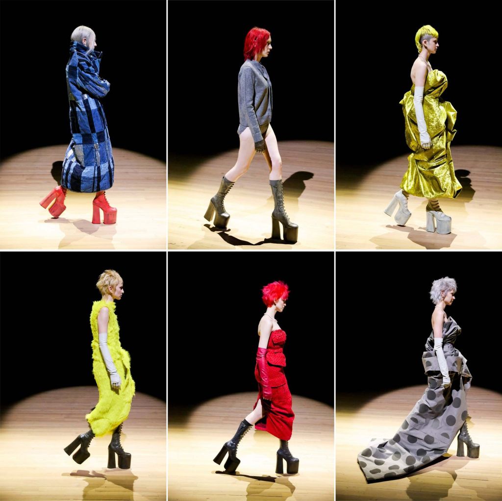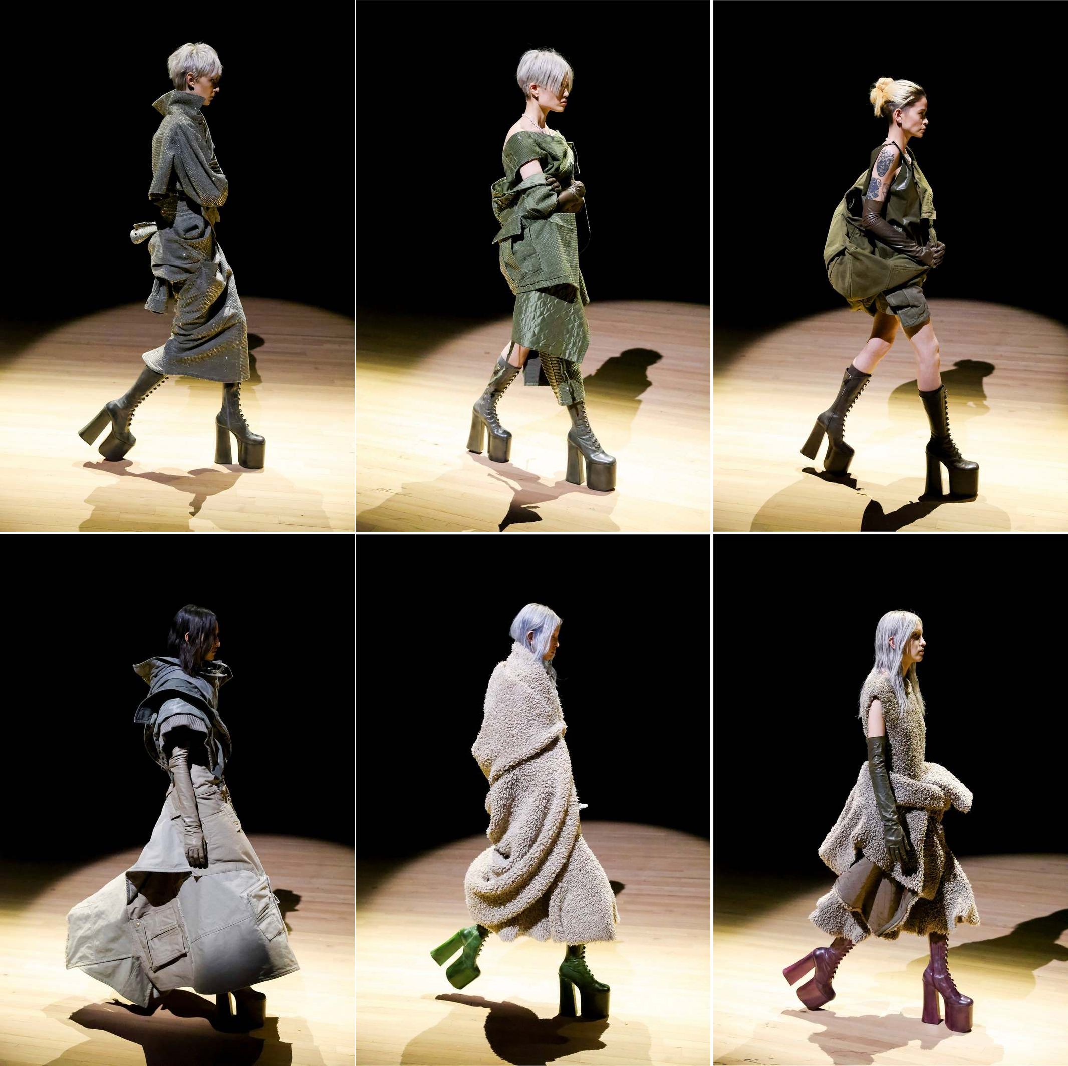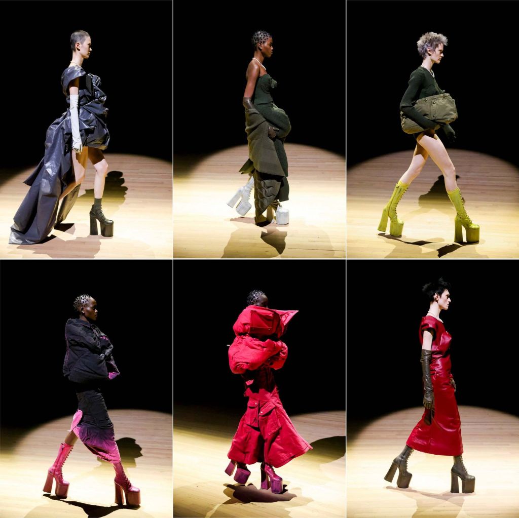 And he quoted his hero, Ms Westwood, in the show notes: “Fashion is life-enhancing. And I think it’s a lovely, generous thing to do for other people.” But what life enhancements did Mr Jacobs offer that his heroes had not already propose in the past? And how lovely was it the thing he did for other people not his potential customers? It was not immediately discernible in the Park Avenue Armory, the show location he abandoned some three years ago for the New York Public Library. Back in the cavernous space, he staged a somewhat bleak show, soundtracked by a solo violinist playing the frenetic, scratchy notes of Philip Glass’s ‘Knee Play 2’ from the 1975 four-act opera Einstein on the Beach. The show space was in total darkness except the runway. Models emerged, arms—in leather opera gloves—folded across the chest, walking as if they were restrained in straitjackets. They were all in platform boots—evocative of the Vivienne Westwood ones that caused Naomi Campbell to fall on the former’s runway show in 1993. But another name came to mind, too: Rick Owens. Mr Jacobs has a deep fondness for the boots by Mr Owens, and his version for his latest collection was reminiscent of those, even if just profile-wise.