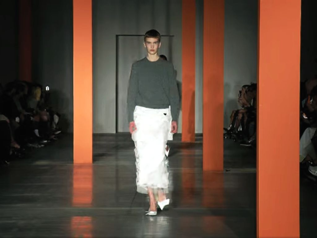Perhaps it was the bareness of the runway that allowed us to focus on what was coming down it. The show was, as before, held at the brand’s own space, the Fondazione Prada. Only existing pillars, painted in what could be traffic orange, could be considered sets. But as the show proceeded, floral casings—in white blooms and green foliage—slid down, as if a bridal show was to unfold. We were enthralled by the soundtrack too: First, a menacing industrial growl/hum, and then Roxy Music’s In Every Dream Home a Heartache, a brief transition of Vangelis’s electronic Spiral, before The Kinks’s I Go To Sleep. And then, totally unexpected was The Blue Danube waltz by Johann Strauss! Was the highly mixed genre (which, to us reflected more Mr Simons’s taste than the maison’s) a reflection of the no-fixed theme of the collection? Sure, the show notes mentioned, menswear, uniforms, and, er, wedding dresses—did these explain those white skirts? And the floral display?
