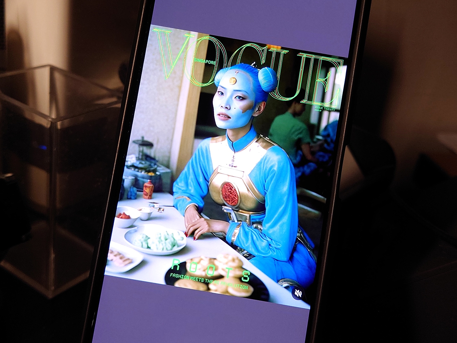 Someone said to us that Vogue SG is reaching out to a new generation. And which might that be? Cerulean children? The latest cover does tell us that the issue is themed “fashion meets AI revolution”. The image is created by the intelligence that is artificial and cold. Vogue SG has been pro-technology and likes illustrating how digital means can be employed to manipulate the images it uses to communicate to the weary, the blasé, and the aloof, and to induce them to buy a copy of the magazine. In tandem with the rise of ChatGPT, the title and its EIC are, perhaps, showing the world that it is truly ahead of the digital curve. But, if there is one thing this cover proves, AI is yet to be better than human touch. Curiously, rather than make a boast of the talents we have here, Mr Lim chooses to work with a Mumbai-based AI artist. Perhaps this ties with his desire to “return to our ‘Roots’ and rediscover who we truly are as South East Asians” (India is not part of SEA), as he declared on IG. And discover we tried, but it has been futile. Besides, what are the chalk-green biscuits on the table? Are they part of our “roots”, too?
