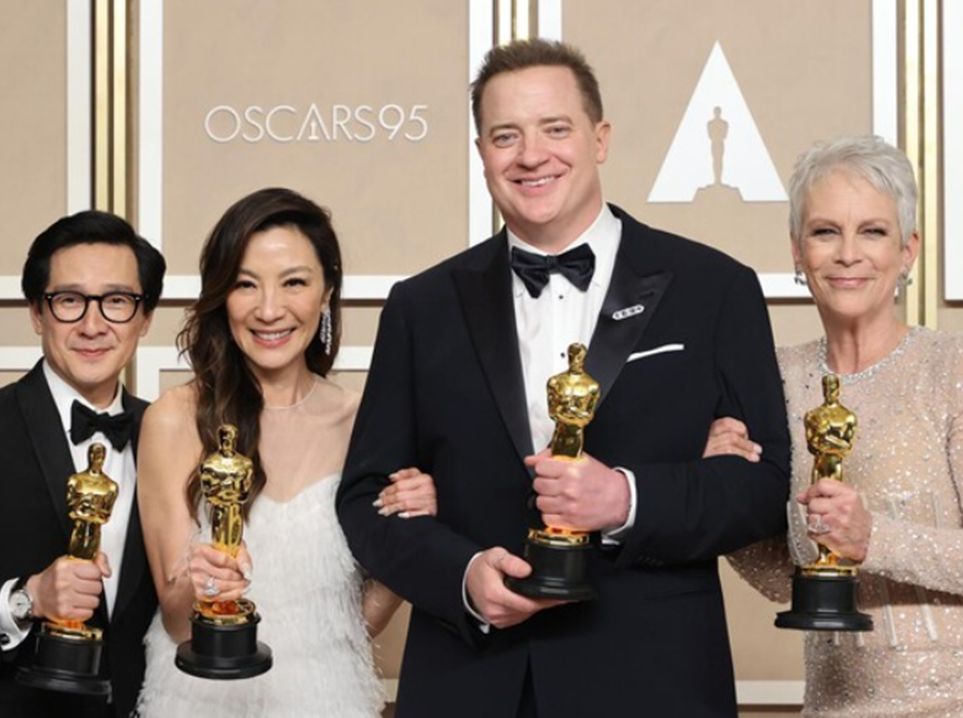 Of the four acting awards, three went to EEAAO. From left, Ke Huy Quan, Michelle Yeoh, Brendan Fraser, Jamie Lee Curtis. Photo: ABC