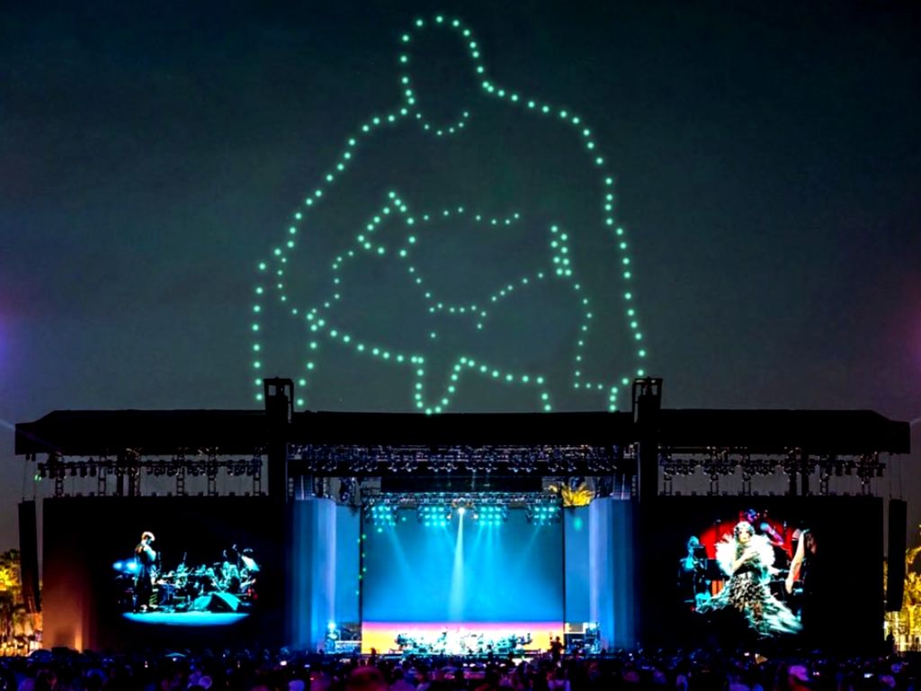 The Reykjavík-born star, as a performer, has always offered a total experience. At Coachella, her costumes were not the only compelling component of the show. Just as the music was sonically wondrous (even if not exactly rocking, including the cinematic Hunter and Isobel, and the Oscar-nominated I’ve Seen It All), the stage set up was a visual treat as well. The action, in fact, was concurrently happening above-stage, as in the air. An army of drones, 864 of them, dotted the sky with military precision, just over the roof of the stage, forming gleaming fractals of shapes, some extraterrestrial, some human, such as a hulk with an incredible dong, squatting—and watchful.