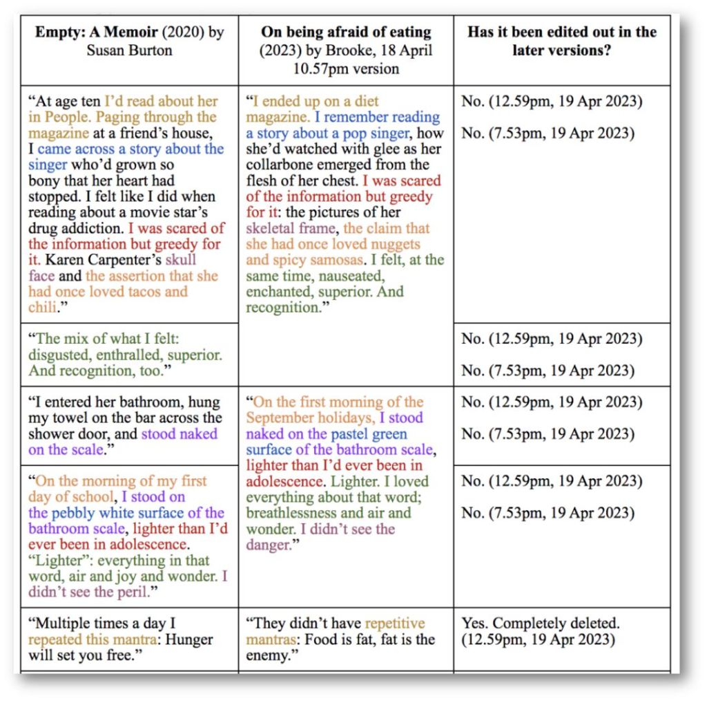 That Ms Lim was happy to imitate someone else (to match up or surpass the target, it is not clear) does raise the question of how authentic she really is. If she urges her young followers to emulate others, might she, too, do the same, even if momentarily (or “a day”)? If this is her “productivity tip”, as she described it, could it also be a writing tip, to be used creatively and professionally? Ms Lim was called out for plagiarism by anonymous TikToker @sugaresqueessay days earlier. She posted a piece of writing, On Being Afraid Of Eating, on 18 April on her blog Grayscale Copy (was this meant to be telling?), which is now password-protected, that purportedly bore similarities to 13 different authors’ published works that included books and articles. According to a lengthy breakdown of her alleged appropriation, shared as a Google doc and broadcasted on TikTok by @sugaresqueessay, Ms Lim’s writing is an “autobiographical recount” in which “more than half of the original version of her essay was not written by her (the investigators pointed out “over 70%)”. As we are unable to read On Being Afraid Of Eating (the post has been removed), we go with the claim that “the similarities include sentences, whole paragraphs, plot points, and specific details… with no credit whatsoever to the original creators”. Could this be, to her, just another session of emulation, rather than plagiarism?