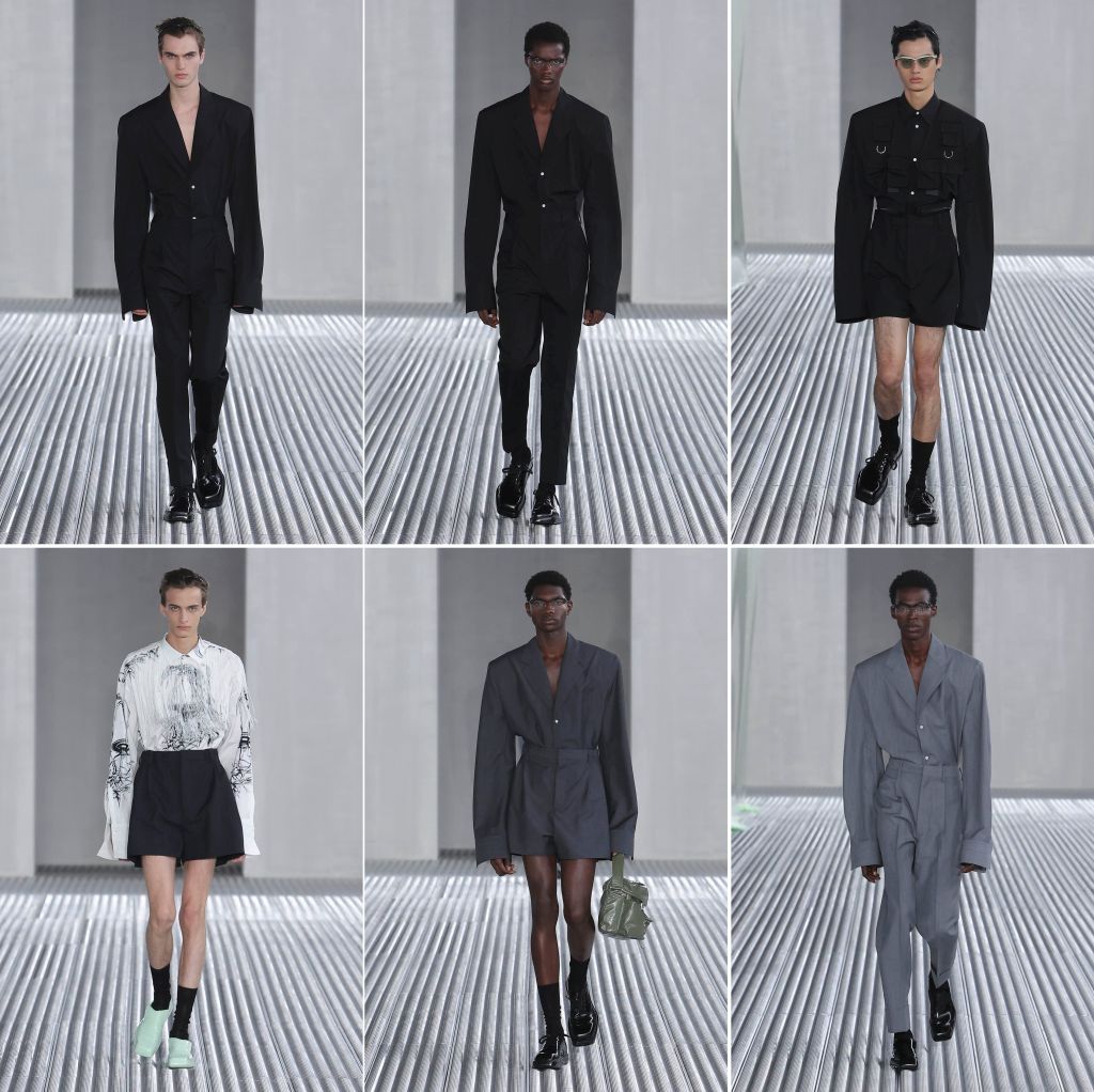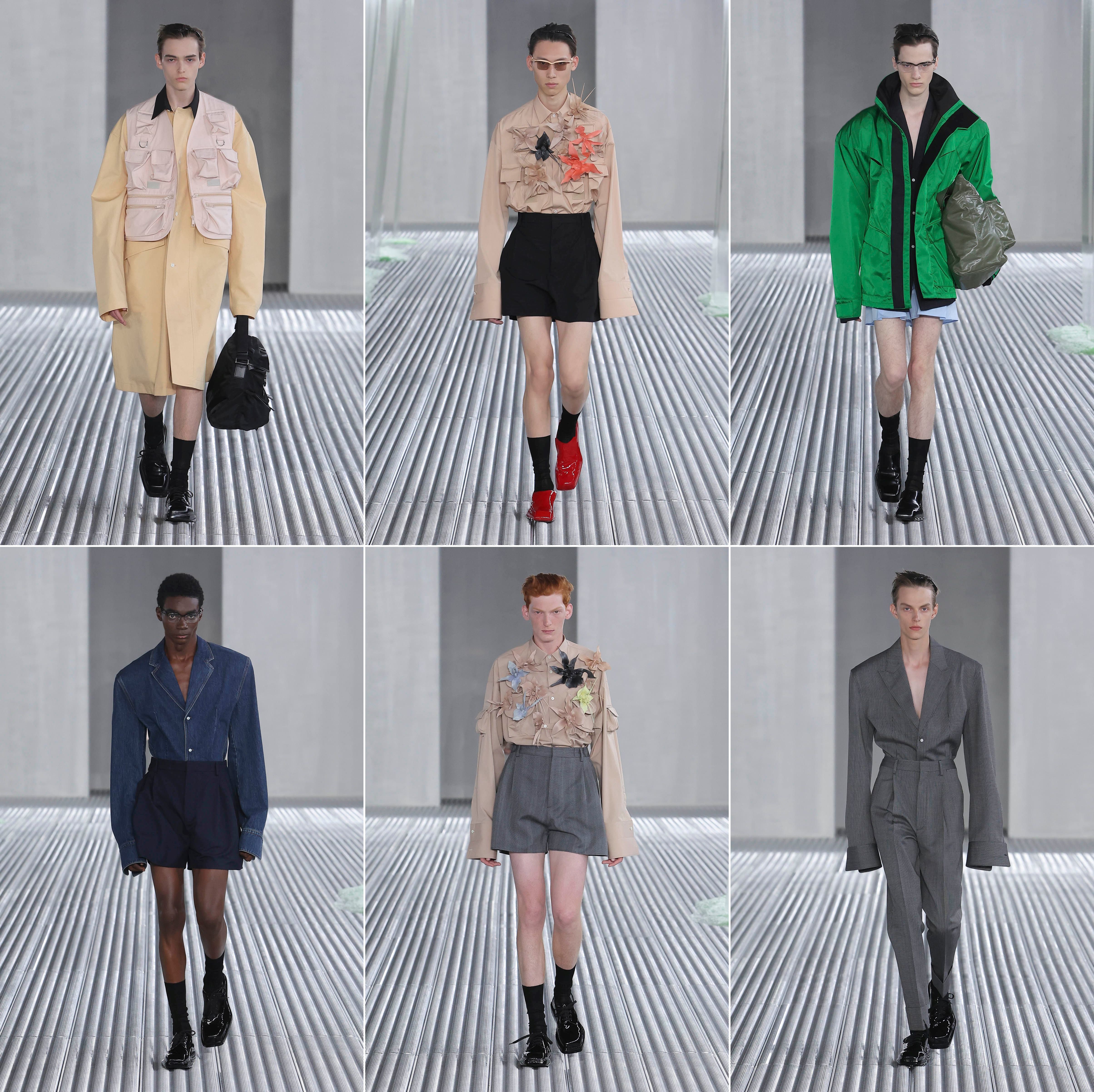 The emphasis on the waist, made even more trim by the broad-shouldered shirts and the shorts worn high on (or even above) the natural waist, were the key proposals at Prada for spring/summer 2024. The shoulder were not designed to accommodate over-built deltoids. Oftentimes, they were padded—and extended—to give an impression of broad shoulders, but not, thankfully, those that Thor’s would be able to fit into. The shorts, also thankfully not terribly brief, were nipped in the waist, which rendered a svelte narrowest part of the torso that is uncommon among adult males, unless the very young. Men generally do not wear a shirt and think about the waist or how to emphasize it to make it appear the result of sustenance on liquids that are not beer or its kin. This is not the equivalent of the hour-glass figure; this is the extreme ectomorph.