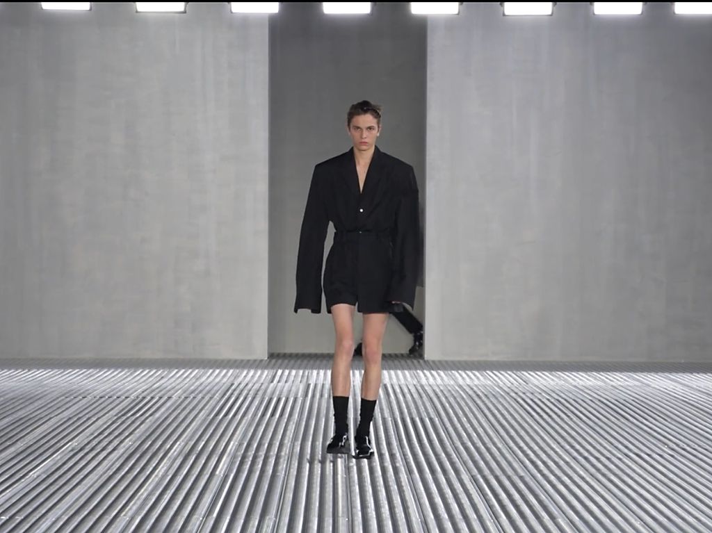 Prada sent out their lanky boys at the usual show site in the Fondazione Prada. The set is typically minimalistic. This time, more industrial than before. Less than a minute after the first model appeared, a stretch of clear gooey substance flowed from the ceiling at what seemed like random intervals to the floor, forming a clear vertical screen that—thankfully, again—did not become some gelatinous entity that could be attributed to the Blob form the 1958 movie of the same name. The well-behaved viscid material flowed right through the runway floor, which appeared to be grating, probably installed to provide drainage beneath. Prada has been particularly interested in letting things descend from the ceiling these past seasons, but this time, whatever came down divided the audience and the models, as if to show two worlds. It was amazing no one watching put their hands through to see what’s on the other side, even when one of the two songs soundtracked by Nine Inch Nails, was, ironically Closer (the other was A Warm Place).