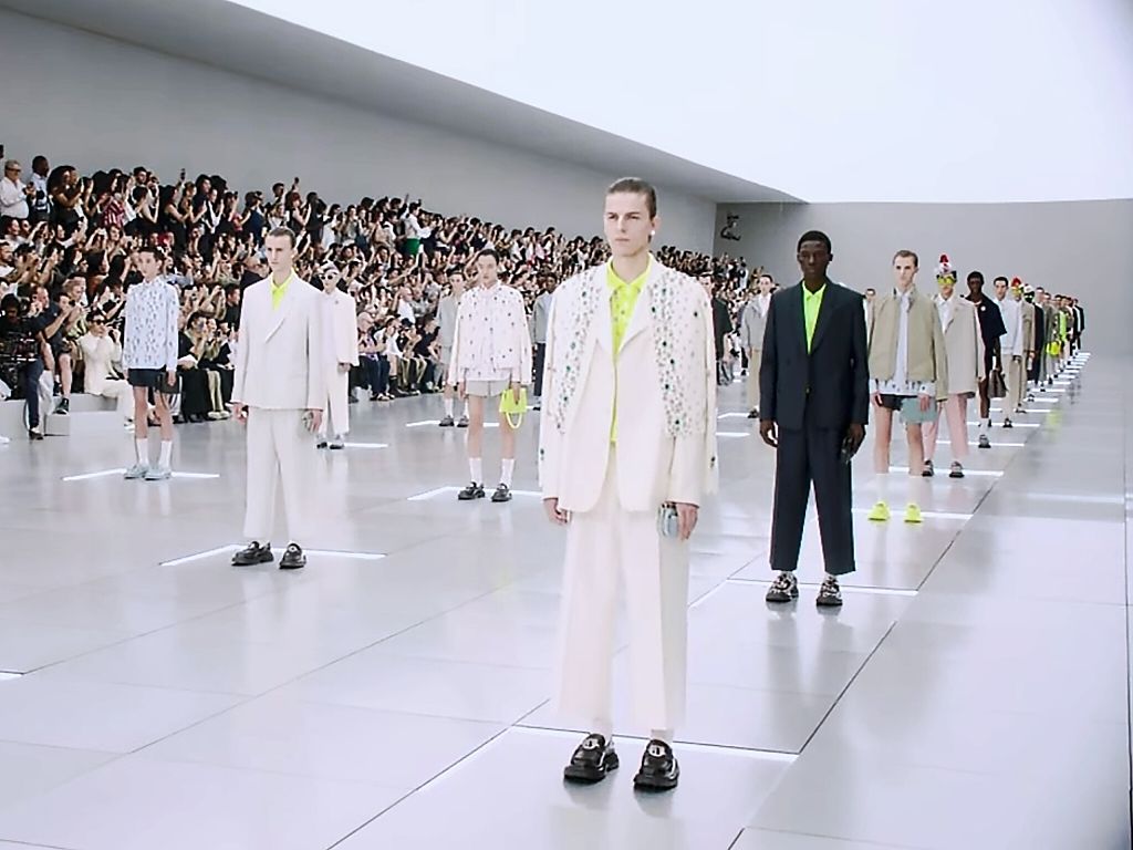 And this was so in a set that could pass off for a Hollywood depiction of the space in which an almighty operates—free from the material, but not the mortal. In a purpose-built shoe box—erected outside the Louis XV-founded École Militaire (military school)—that was coloured the cool gray of the house, the models emerged from beneath the grit floor, all at once, through a hatchway that probably no one thought was there. In an era when AI could do practically everything, this might have been the staging of a higher intelligence not related to ours. But it was not. As robotic as the proceedings went (even the models appeared rather droid-like), the clothes was, by contrast, softer, more fluid, and imbued with palpable emotions. It helped, too, that Primal Scream’s emotive, swirling, non-hip-hop, Glastonbury-worthy 1991 single Higher Than the Sun soundtracked the show.