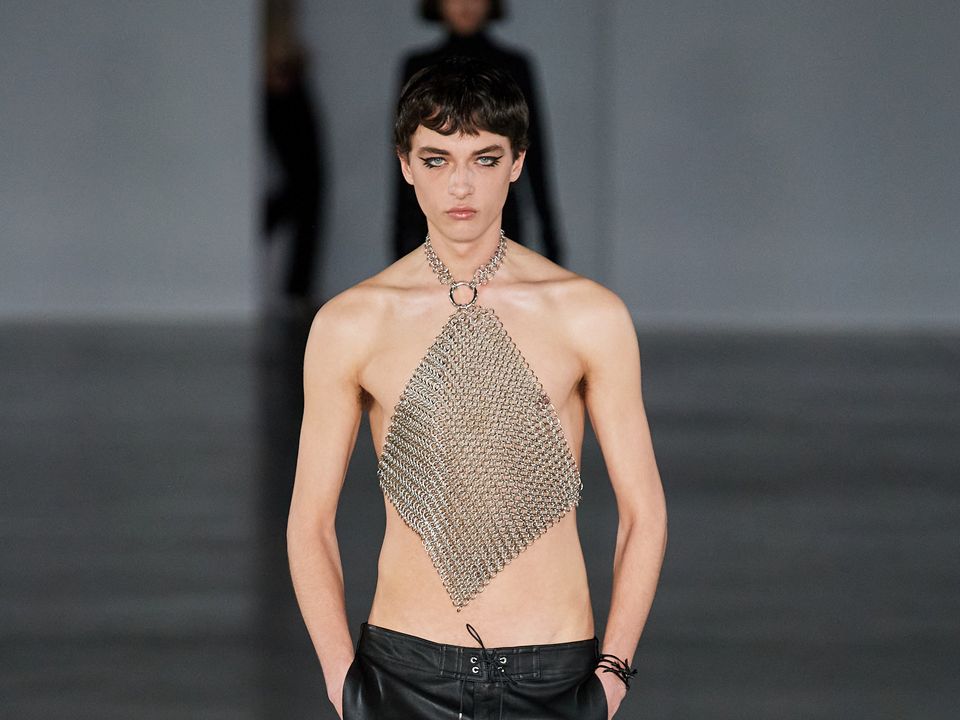 For now, let’s just call what Mr de Saint Sernin had on a dudou. The top he wore, however, was not entirely new or unusual if we look at his recent work. Variations of that chest wear has appeared before, including one, I distinctly remember—in chainmail—from the autumn/winter 2022 collection. Did it look more masculine then? Was it a butch bib? Did it constitute a garment? Perhaps these aren’t the questions to ask since the aesthetical difference between his menswear and womenswear was rather blurred. The latest co-ed collection he showed was called Lust, which may explain Mr de Saint Sernin’s choice of top or the many others in the collection that were basically pieces of cloths, too. Seriously, I do not know if the title meant great sexual appetite or ardent enthusiasm in, perhaps, tops that, if aren’t underwear, are very short aprons.