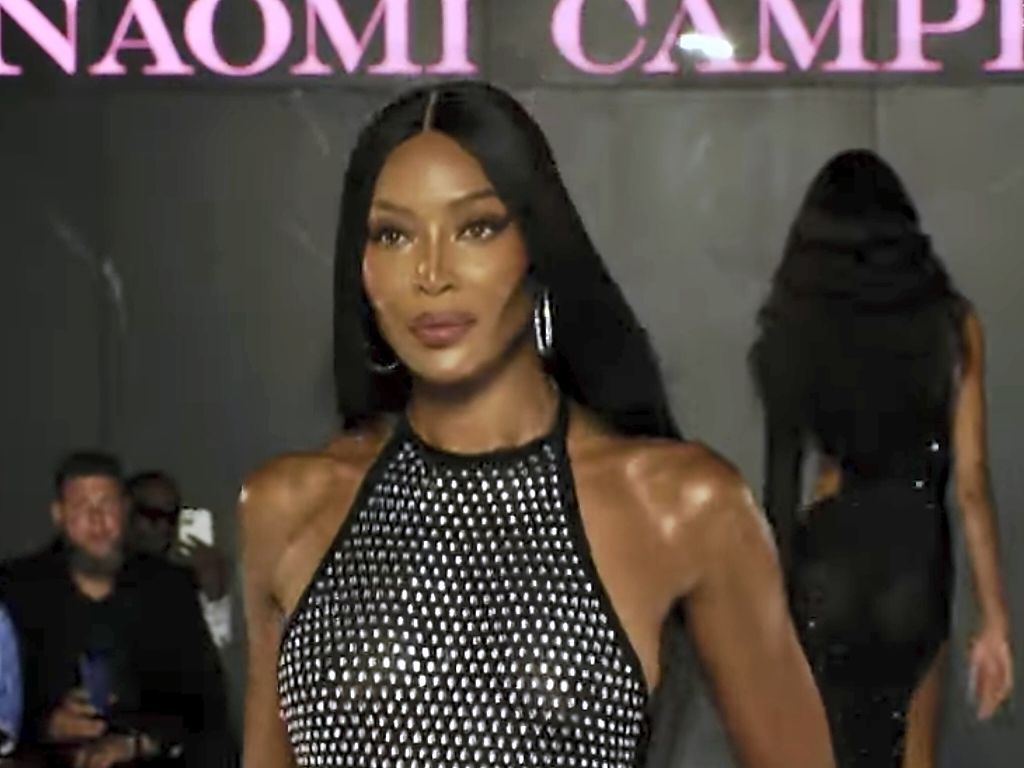 Naomi Campbell modelling her own design for PrettyLittleThing. Screen shot: PrettyLittleThing/YouTube