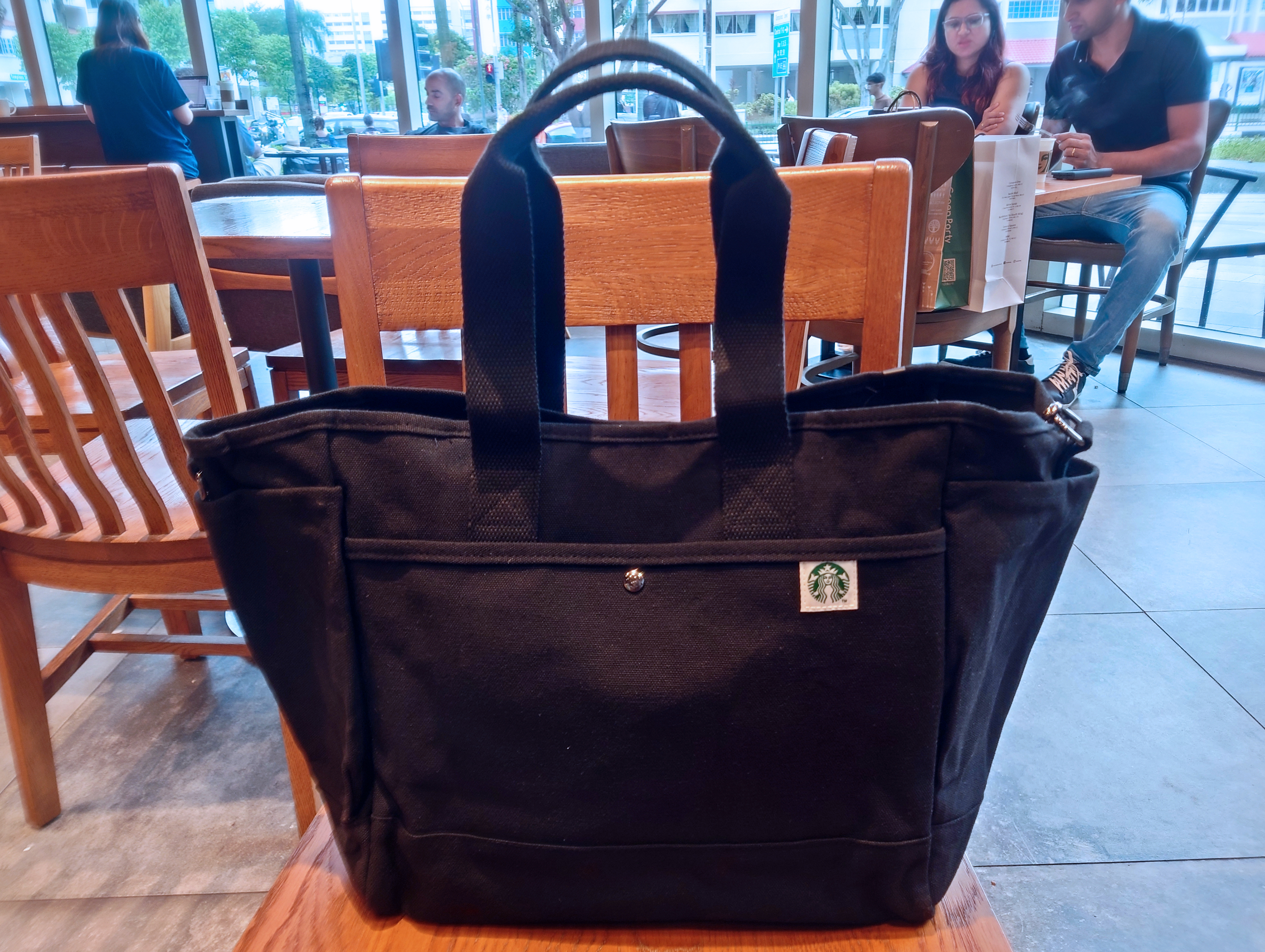 In a east-west orientation, the tote is surprising of a good size, both for men and women. And capacious enough to store whatever you need for school or work. There are also unusually more pockets than what one would expect from a coffeeshop-branded bag: six, three inside and three out. One interior pocket is placed on one of the narrow sides, which is ideal for a bottle of water or umbrella. On the exterior, there are two side pockets too, which would come in handy when you need to buy yourself and a loved one a drink each, and dedicated space in your bag for the cups is preferred. Despite the clearly appealing storage options, one aspect is less so. The bag is made of relatively lightweight cotton canvas, rather than the studier tightly woven duck canvas. Regardless, the Starbucks tote is a practicable carryall.