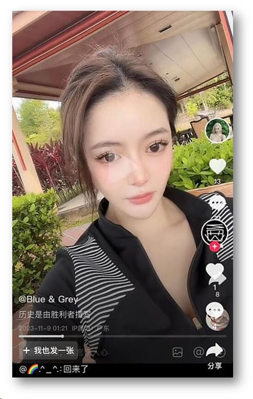 In that screen shot, she did not appear to be worn out by her time in jail (reportedly, a third of the five-week, five-day sentence was deducted as she was well behaved behind bars). It is possible that her face is Meitu (美图)-enhanced. She was dressed somewhat modestly in a black, zip-front athletic top with striped yoke—not her typical outfit seen on her Douyin posts. But, a look at her Douyin history revealed that the top did appear in a post from last September, accompanied by the strange comment, in English, “I am not sweet enough” and a soundtrack of a stranger still kiddy ditty, in Chinese: “What are you doing? Can you buy me a cup of milk tea. It’s not that I have no money.” It is possible that the latest post is not from that time, as her makeup was presently different and her hairstyle, too. Her eyebrows were now less groomed and she wore longer artificial lashes. Even after her ordeal, she was certain to look appealing for her followers.