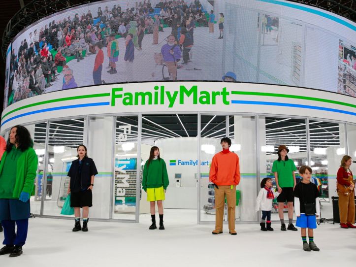 This year’s end, barely a month before Christmas, has turned out to be quite a fashion show season. In Tokyo last Thursday, before Louis Vuitton men’s pre-fall 2024 in Hong Kong, the Japanese convenient store chain FamilyMart is celebrating their 40th anniversary, and have staged their first fashion presentation for their house brand Convenience Wear in the capital’s Yoyogi Stadium, a two-gymnasium complex, sandwiched between two youth fashion hubs, Harajuku and Shibuya. To be sure that this is indeed a konbini event, FamilyMart built a stocked-up circular convenient store as backdrop for the runway (which rather reminded us of the Chanel’s supermarket that the late Karl Lagerfeld dreamed up in the Grand Palais for the autumn/winter 2014 ready-to-wear collection). If it was not quite a riot of a fasshonsho, it sure was a riot of colours.