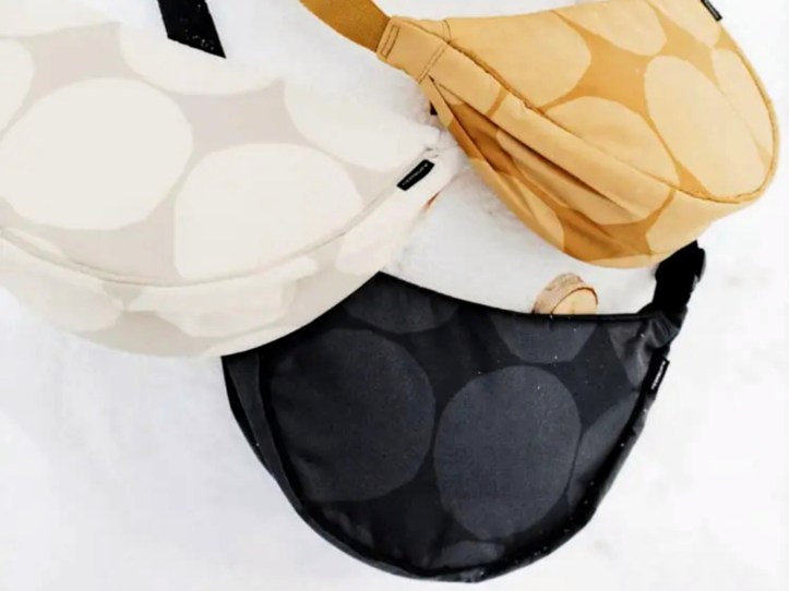 By now, these sort-of crescent-shaped bags are rather ubiquitous. Not only have Uniqlo made the Mini Round Shoulder Bag the must-have of 2023 (as reported by Lyst: “most searched”), they have made them somewhat collectible in versions with prints, such as those conceived in collaboration with the Japanese animation company Studio Ghibli. But if those repeated patterns are a little too much for you, or even kiddy, then Uniqlo’s latest pairing with the Finnish house Marimekko—in a fairly low-key comeback last September—might be it for you. Marimekko is known for their prints, especially their abstract florals, but in this collaboration—the brands’ sixth, abstract and graphic prints are featured and, for these bag, regularly-placed irregular dots known as Kivet (or stones in Finnish).