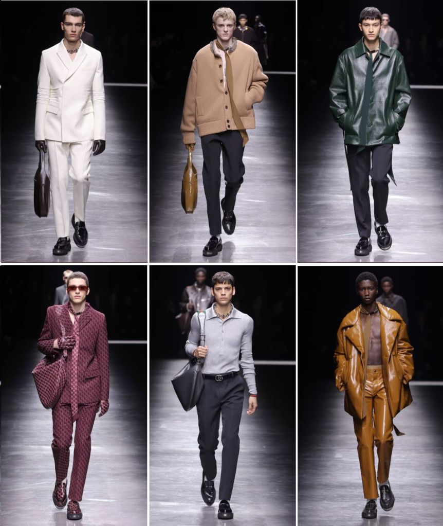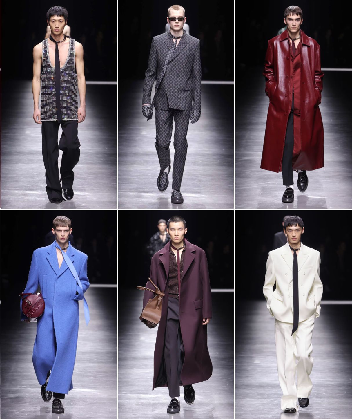 With one neckwear for many of the familiar looks, Sabato De Sarno sent out an impractical accesory to distinguish his debut men’s collection for Gucci