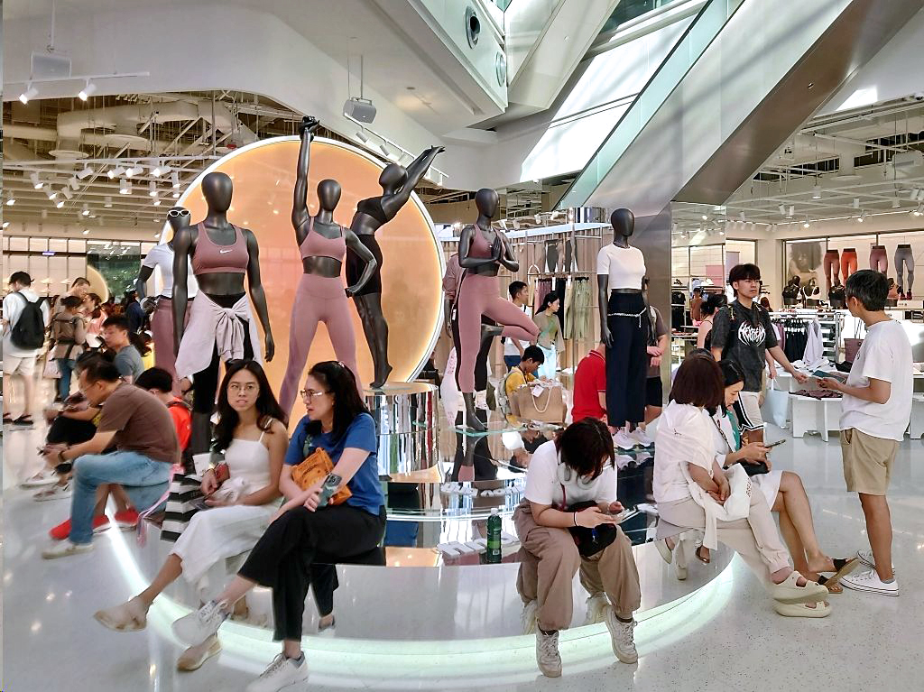 When I walked in, I was really shocked. This was not the swanky new store I had imagined it to be. Sure, I expected Nike Orchard Road, as I approached it from Bideford Road, to be crowded, but not this 乱七八糟 (luanqi bazao) or disordered. It was a Saturday afternoon, the second weekend after the swanky flagship opened. I envisaged what my mother would call a “new toilet” situation, but this was really rather worse. I thought I had entered an indoor pasar malam (night market)—the place was teeming. It was not just the very many shoppers; it was also those not shopping. Facing the entrance of the three-level store was a glass and lit display island on which six mannequins stood in various yoga poses. On the perimeter of this raised platform, there were many who—for some reason not entranced by the store and could not be bothered to browse—sat waiting for others or just enjoying the air-conditioned interior (I could not tell), unconcerned that they were spoiling the visual display.