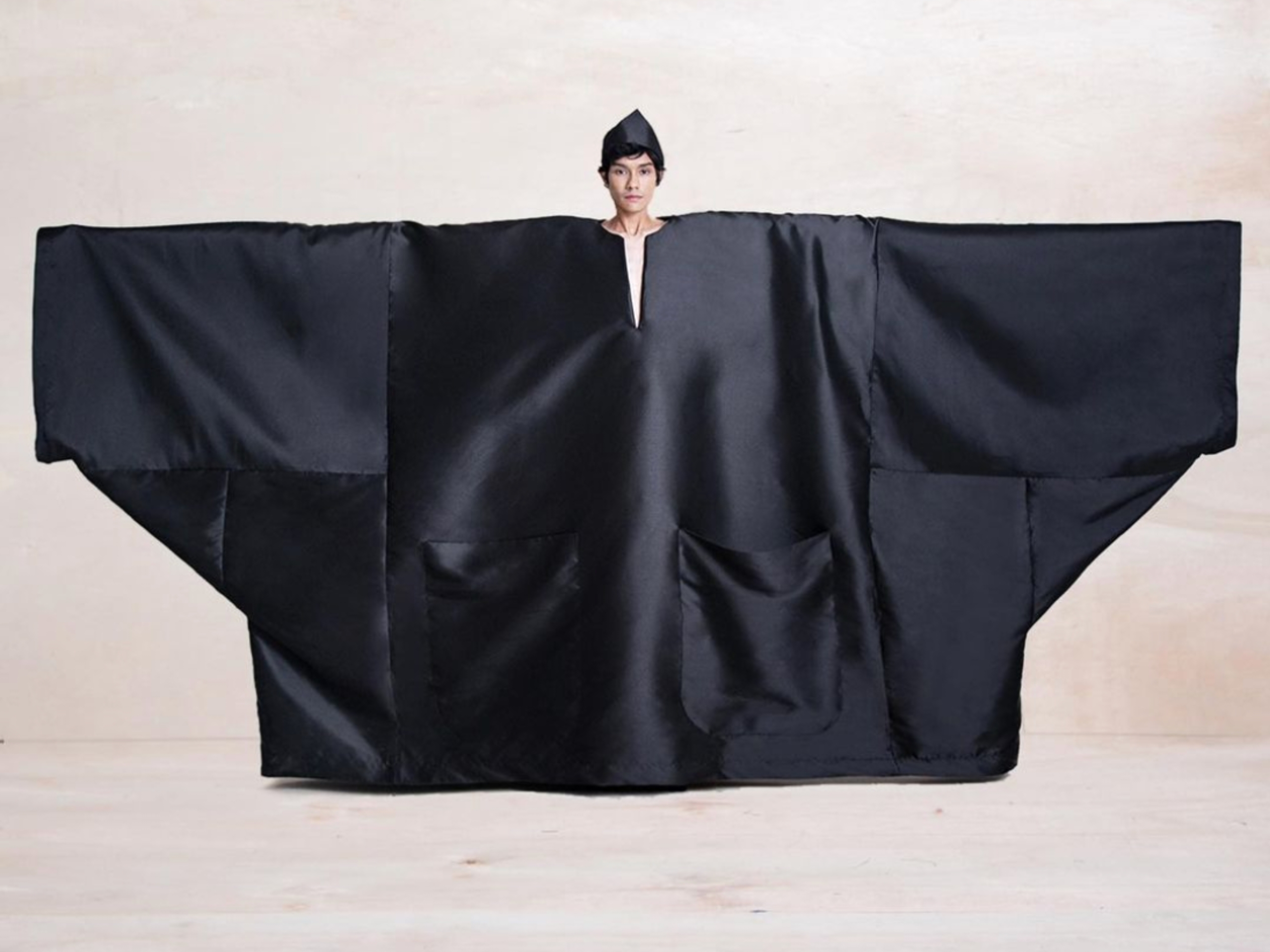 Is big really better? We found ourselves asking this existential question when we saw the above photo that the Malaysian label Behati just posted on their Instagram page. This was an upsized version of the traditional baju Melayu, but it was no ordinary shirt “oversaiz”. This was not just big, such as a baggy sweatshirt; this was enormous, as wide as a rumah kampung (village house) or cadar (bedsheet) stretched on a clothesline. How big can a garment get without being ridiculous? Or gila (crazy)? Or laughable? Behati seemed to have the answer. Their latest creation, described by the brand as “baju Melayu terbesar (the biggest Malay shirt)”, was to be worn, not, as you might suspect, hung on a wall. Or purposed as a tent, even if it looked like one. It was a statement-making attire, an expanse of baju, blacker than the blackboard, and broader than a tikar (mat), which, incidentally, had been used by Behati as outerwear. Or, a stole. Seriously.